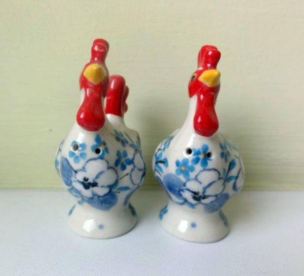 z935 ポーランド陶器 ニワトリ型塩コショウ入れ 白&水色花2羽セット