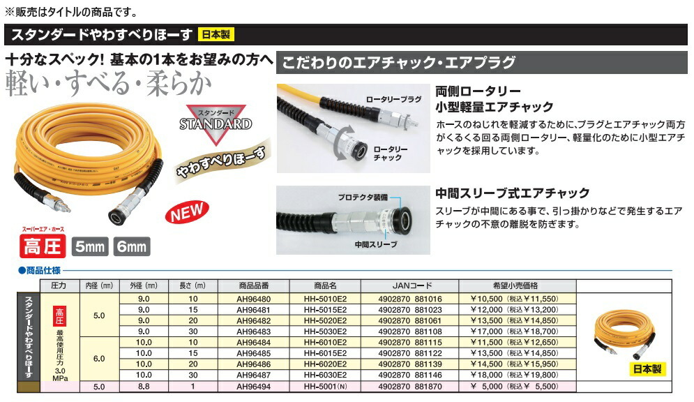 マックス MAX十分なスペック!基本の1本をお望みの方へ!!軽い・すべる・柔らか高圧用エアホーススタンダードやわすべりほーす■仕様商品名:HH-6030E2商品品番:AH96487圧力:高圧(スーパーエア・ホース)最高使用圧力3.0MPa内径:6.0mm長さ:30m■こだわりのエアチャック・エアプラグ■両側ロータリー・小型軽量エアチャックホースのねじれを軽減するために、プラグとエアチャック両方がくるくる回る両側ロータリー、軽量化のために小型エアチャックを採用しています。■中間スリーブ式エアチャックスリーブが中間にある事で、引っ掛かりなどで発生するエアチャックの不意の離脱を防ぎます。