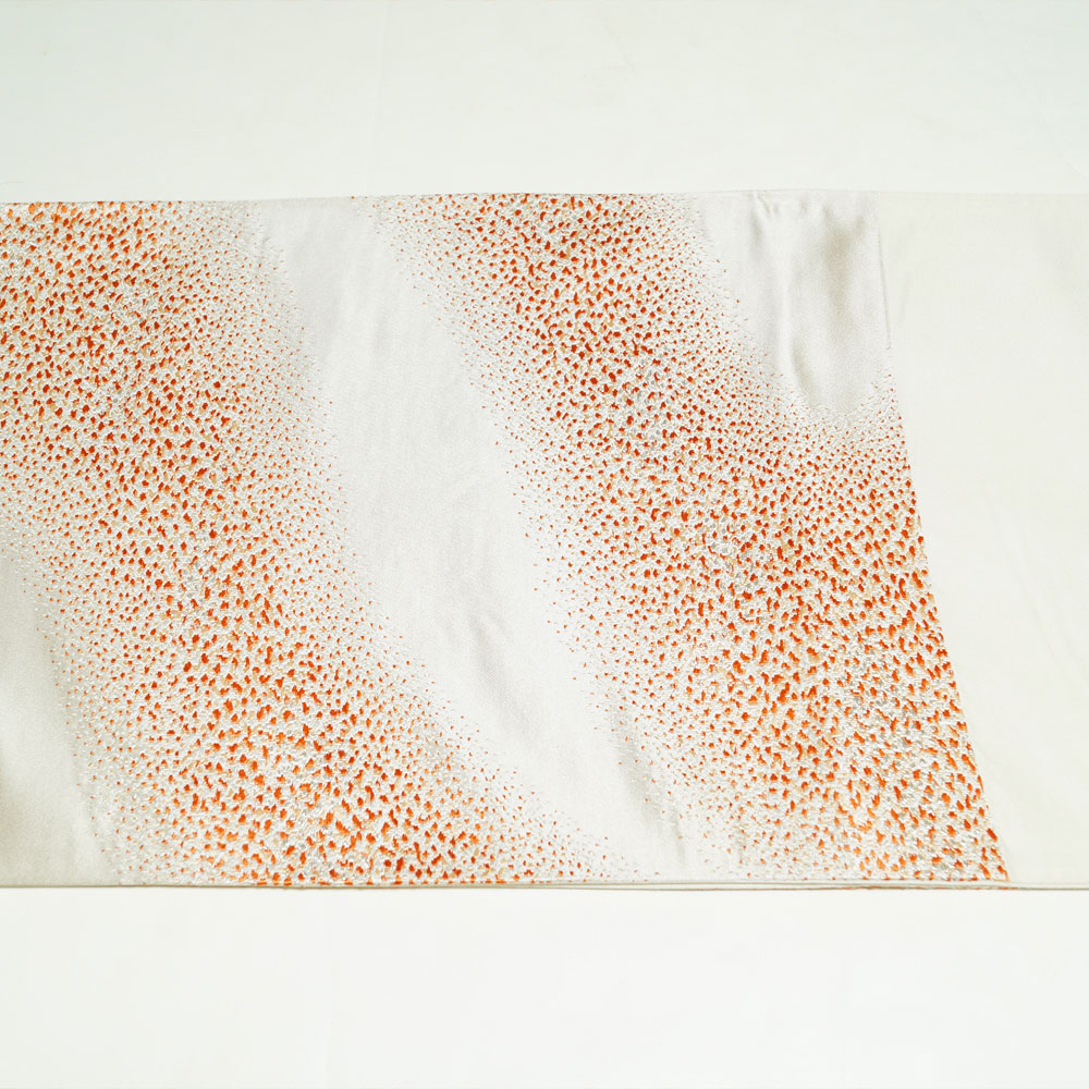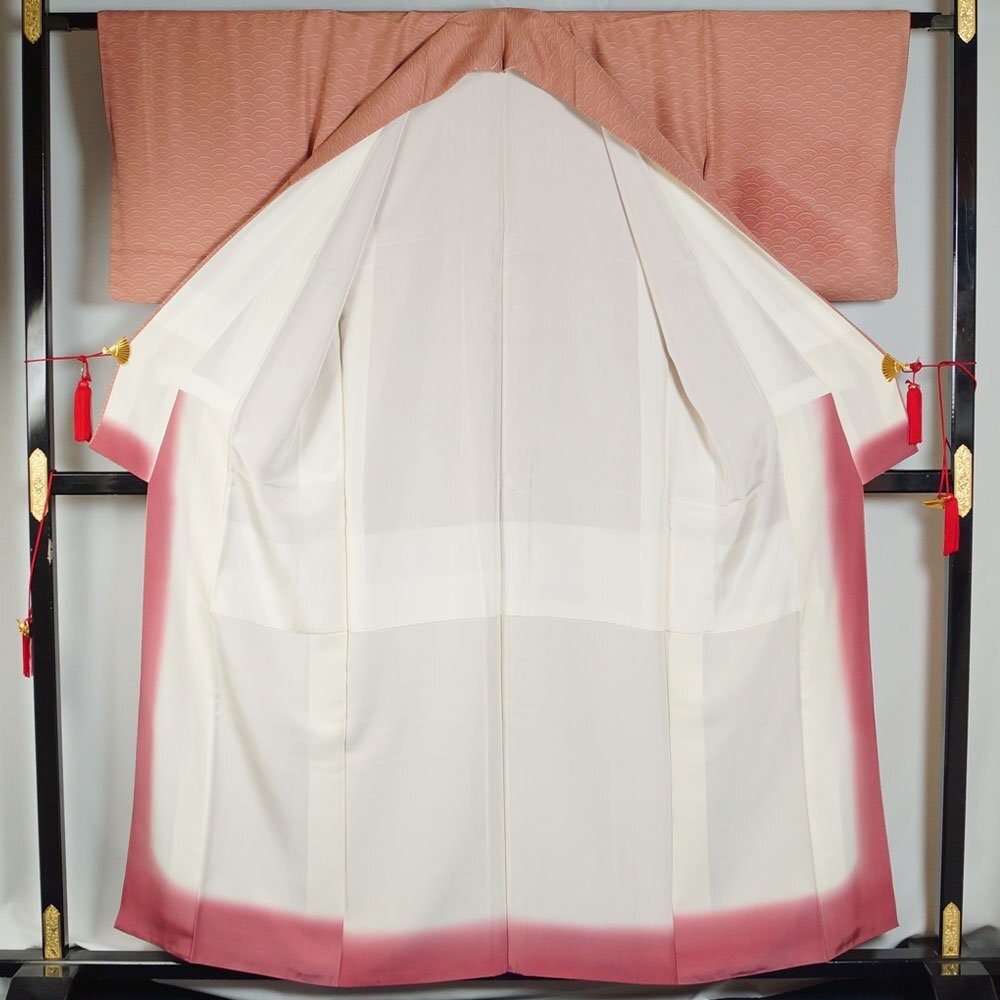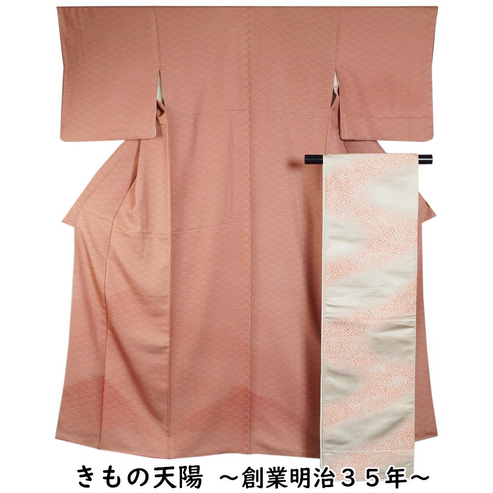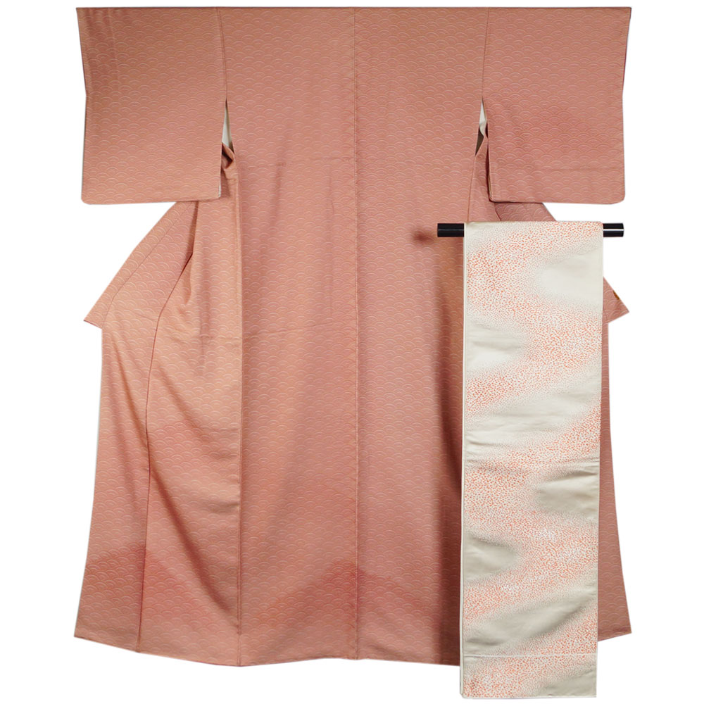| 商品 説明 | 渋めのローズダスト色系の地に青海波にぼかし模様が染められた付下げ訪問着と、白練色系の地に小花霞模様が織られた袋帯の2点セットです。 |