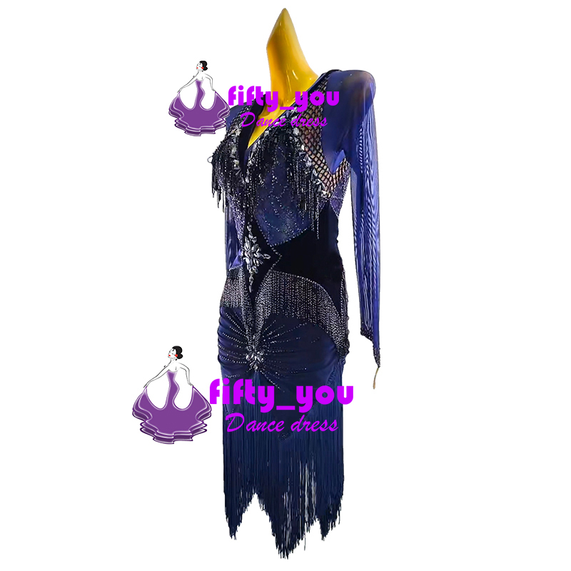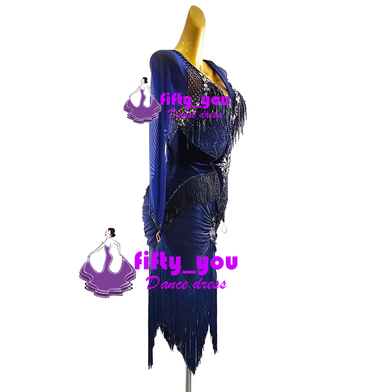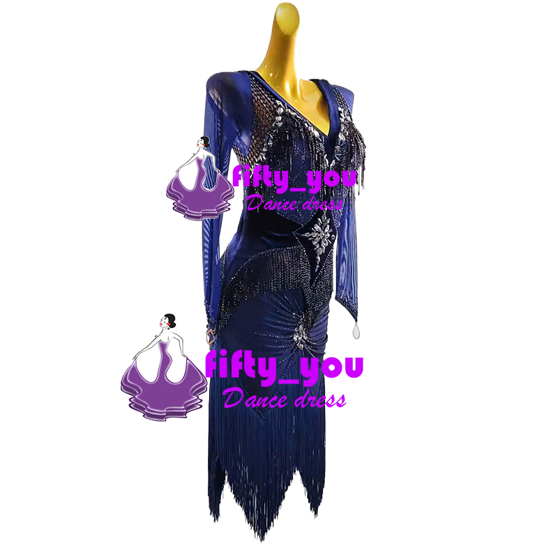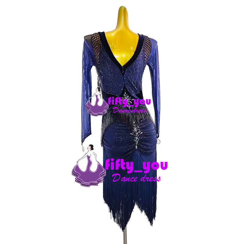 新品fifty_you レディース社交ダンスドレス  ラテン試合デモ用ドレス セミオーダー対応 高級品 ビーズいっぱい飾 ネイビー