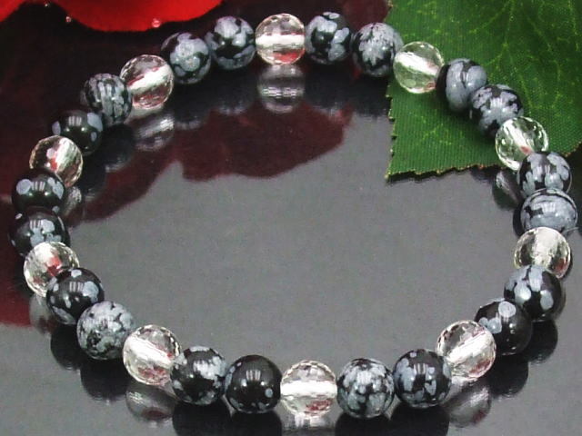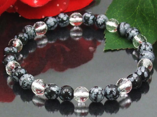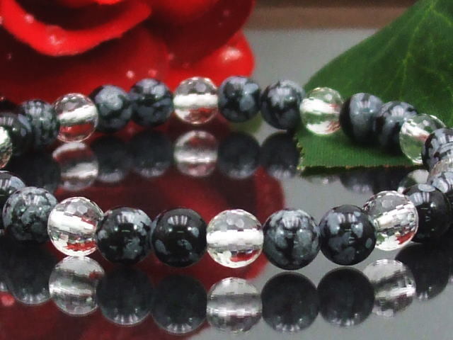 ロロロ 素材 ロロロ スノーフレイクオブシディアン6ミリ 水晶128面cut6ミリ サイズは約17.5cm(内径約16cm) サイズ変更は無料です♪