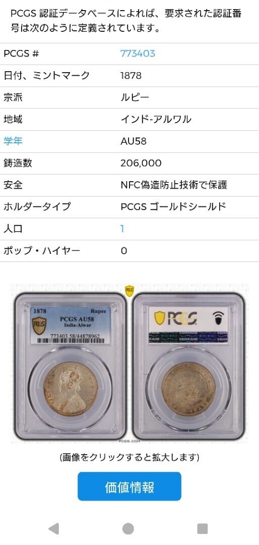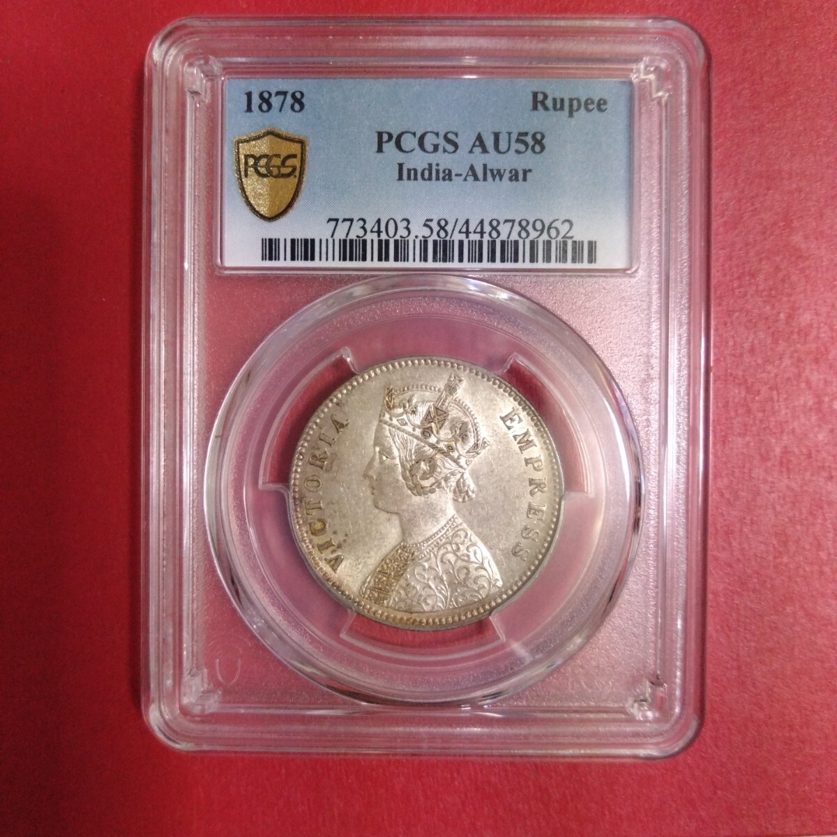 希少1878年 英領インド アルワル州 インド1ルピー銀貨 PCGS AU58