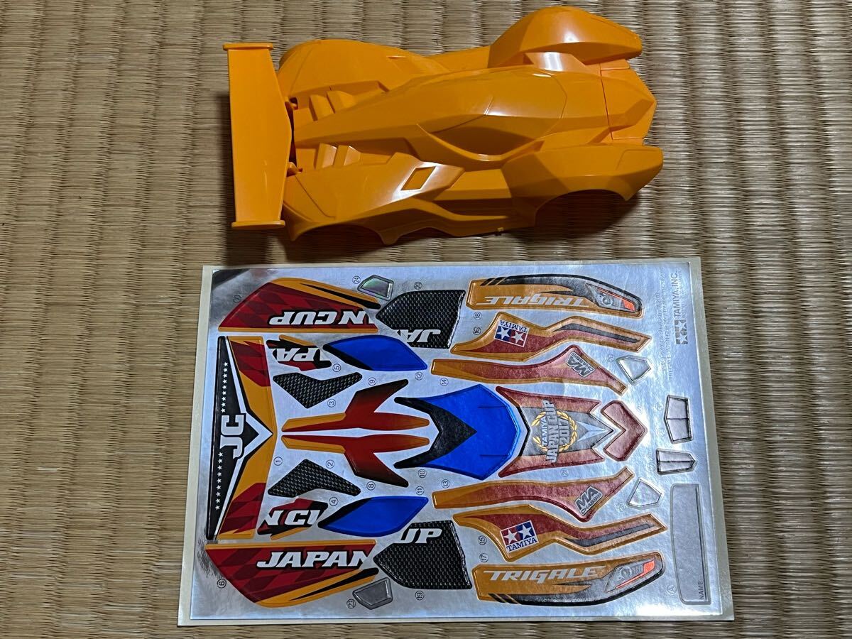 タミヤ ミニ四駆 トライゲイル ジャパンカップ2017限定販売品の組立て済みボディと未使用ステッカーのセットです。