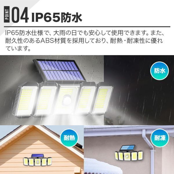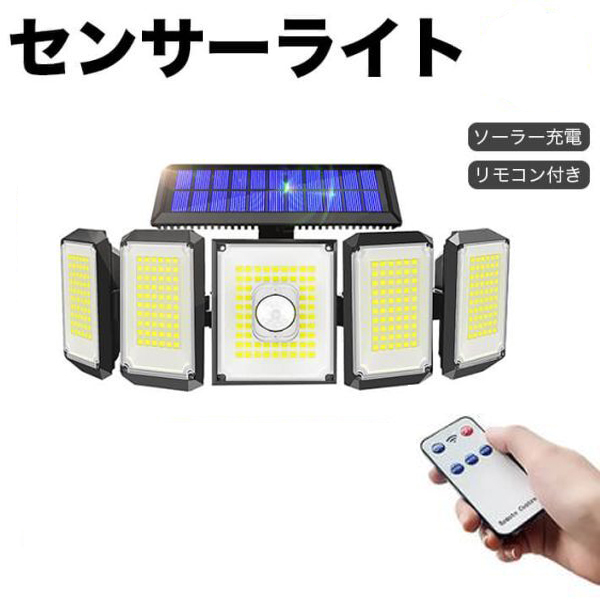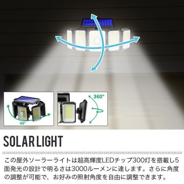 リモコン付き ソーラーライト 屋外 センサーライト 人感 防水 5面発光 300LED 3000ルーメン 2400mAh大容量電池 高輝度 360度角
