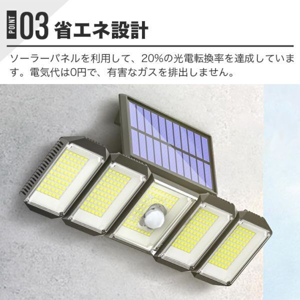 この屋外ソーラーライトは、超高輝度LEDチップ300灯を搭載し、5面発光の設計で明るさは3000ルーメンに達します。両側の4つのライトは360°回転し、さらに左右に90°スウィングが可能で、お好みの照射角度を自由に調整できます。照射角度は約300°で、広範囲を照らし明るさの超拡散を実現します。