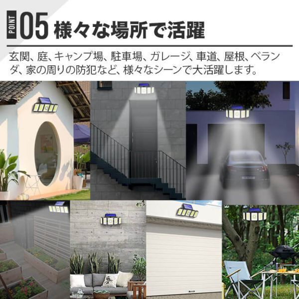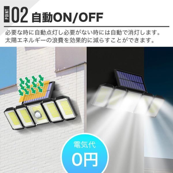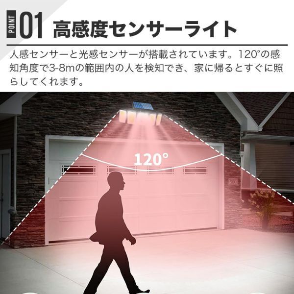人感センサーと光感センサーが搭載されています。120°の感知角度で3-8mの範囲内の人を検知でき、家に帰るとすぐに照らしてくれます。また、必要な時に自動点灯し、必要がない時には自動で消灯します。太陽エネルギーの浪費を効果的に減らすことができます。