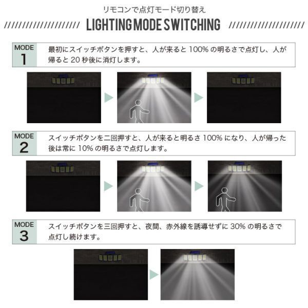 モード3:スイッチボタンを三回押すと、夜間、赤外線を誘導せずに30%の明るさで点灯し続けます。