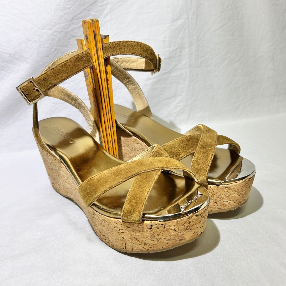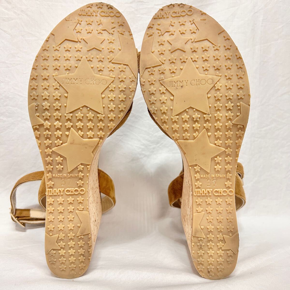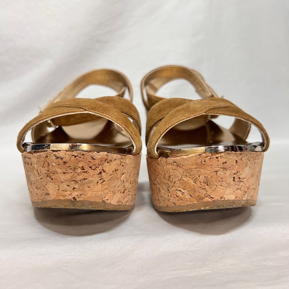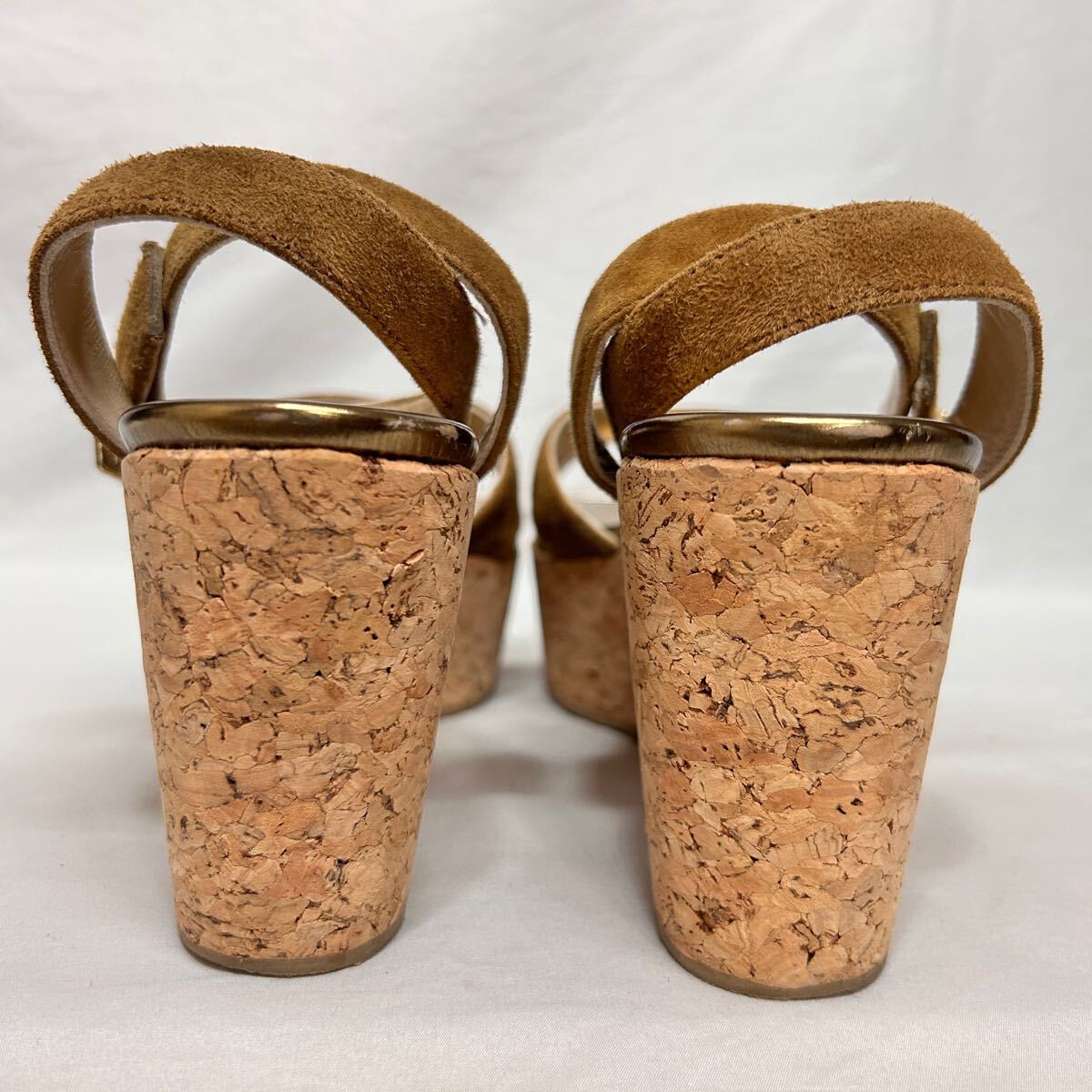 ★美品★37★ JIMMY CHOO サンダル アンクルストラップ スエード スペイン製 PAPYRUS コルク ジミーチュウ ウェッジソール ブラウン(03277F