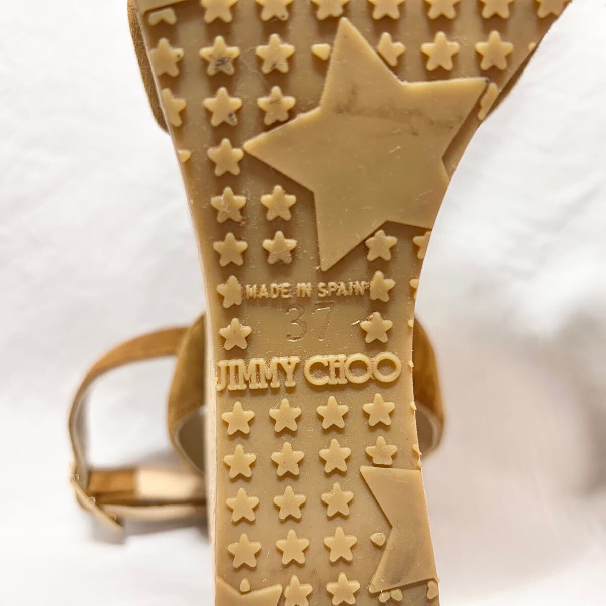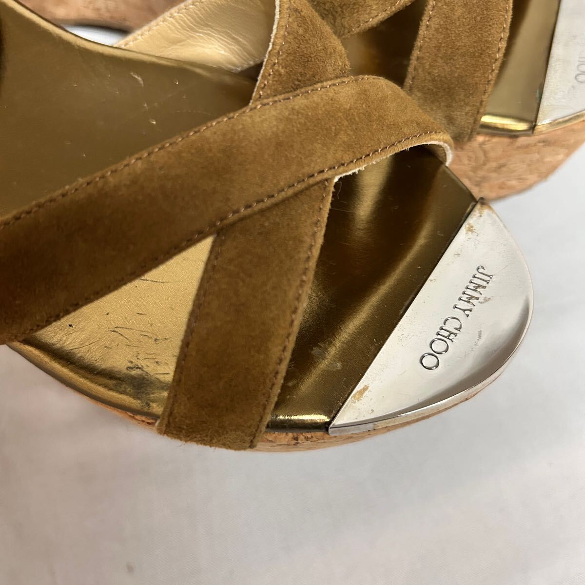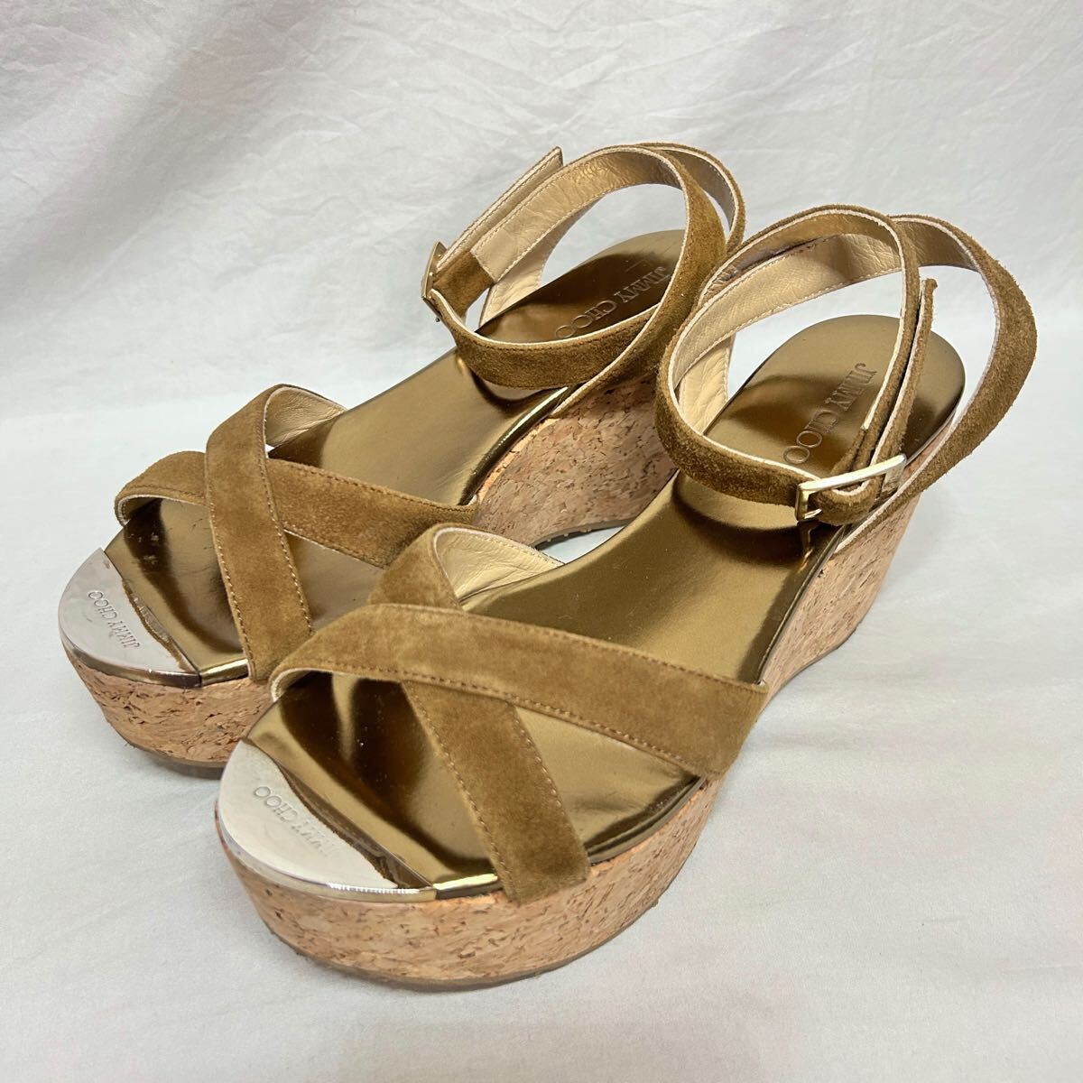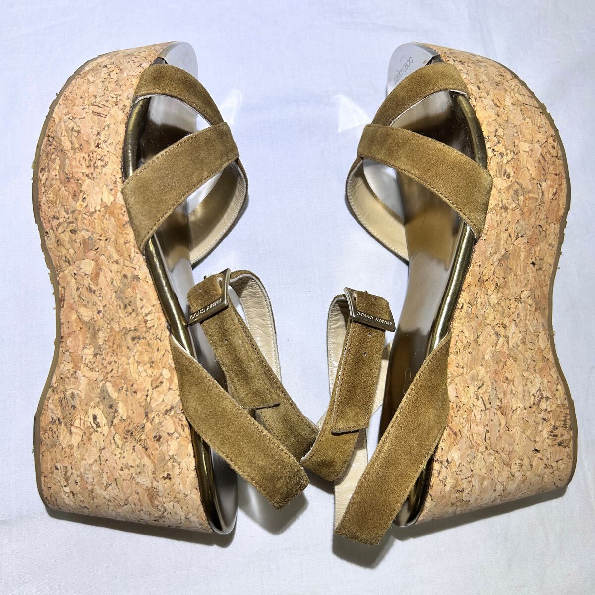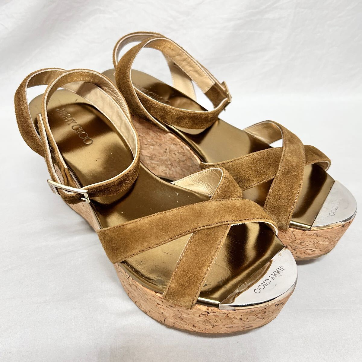 ★美品★37★ JIMMY CHOO サンダル アンクルストラップ スエード スペイン製 PAPYRUS コルク ジミーチュウ ウェッジソール ブラウン(03277F