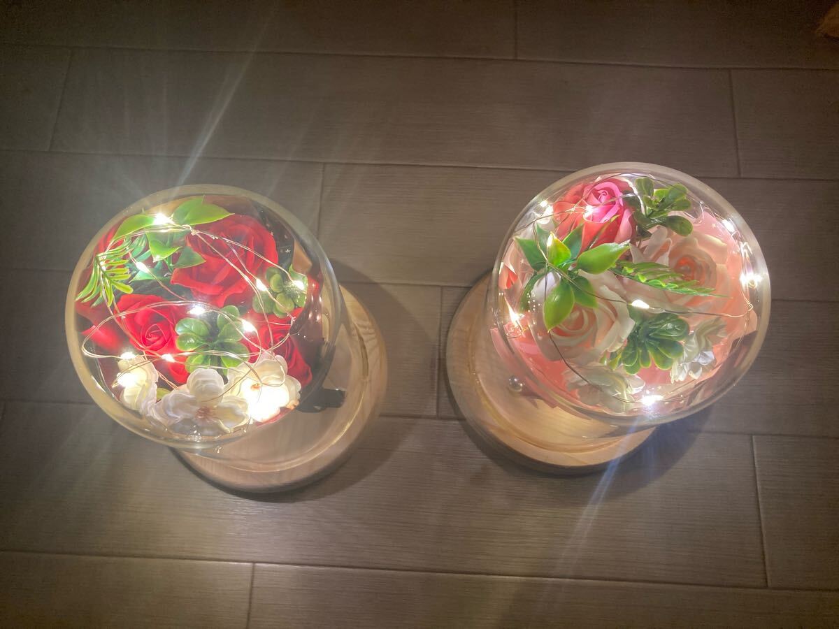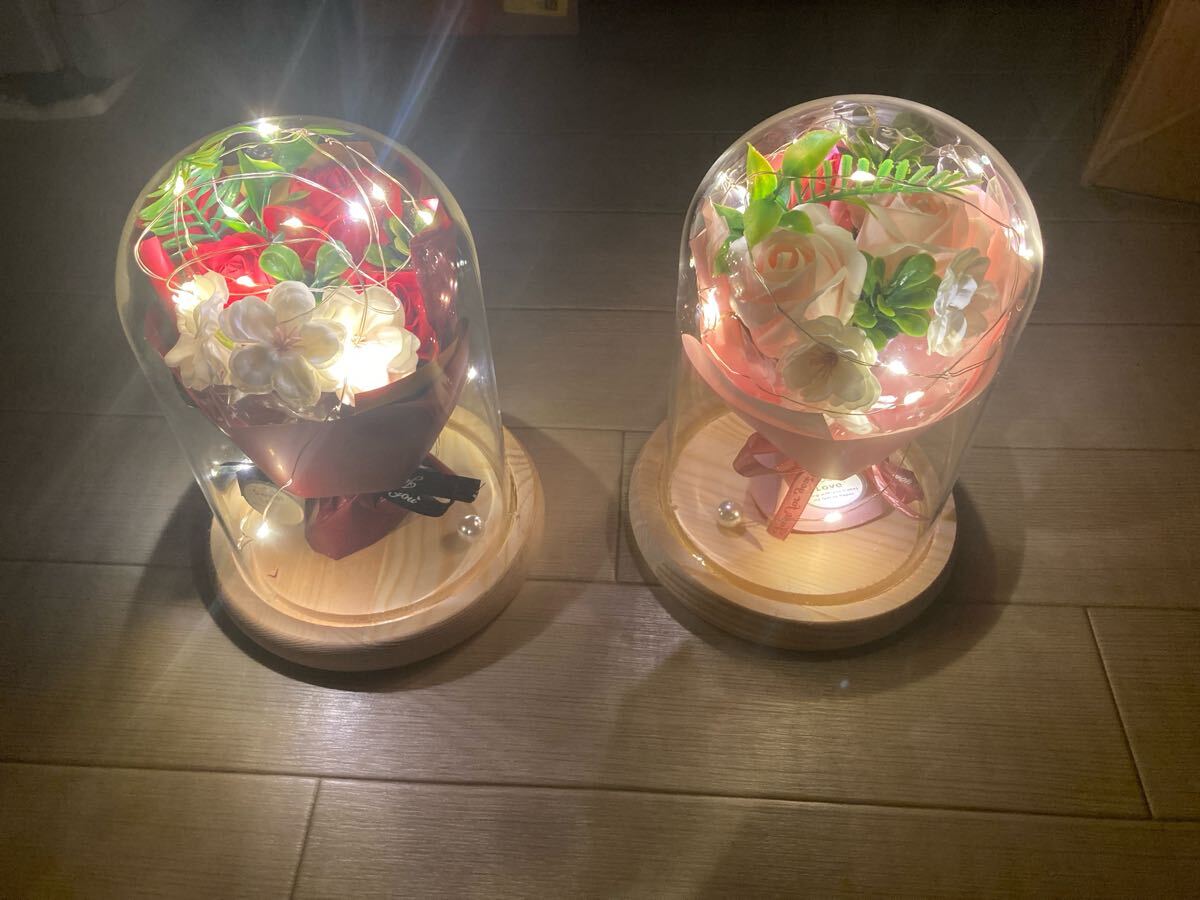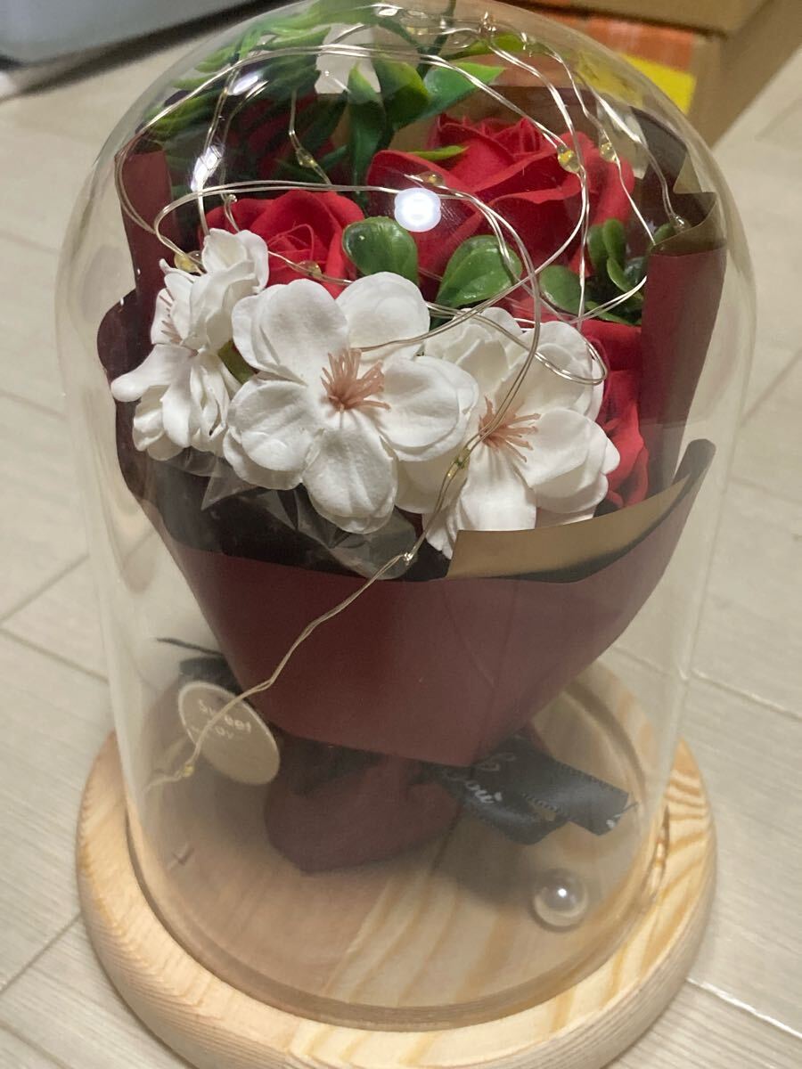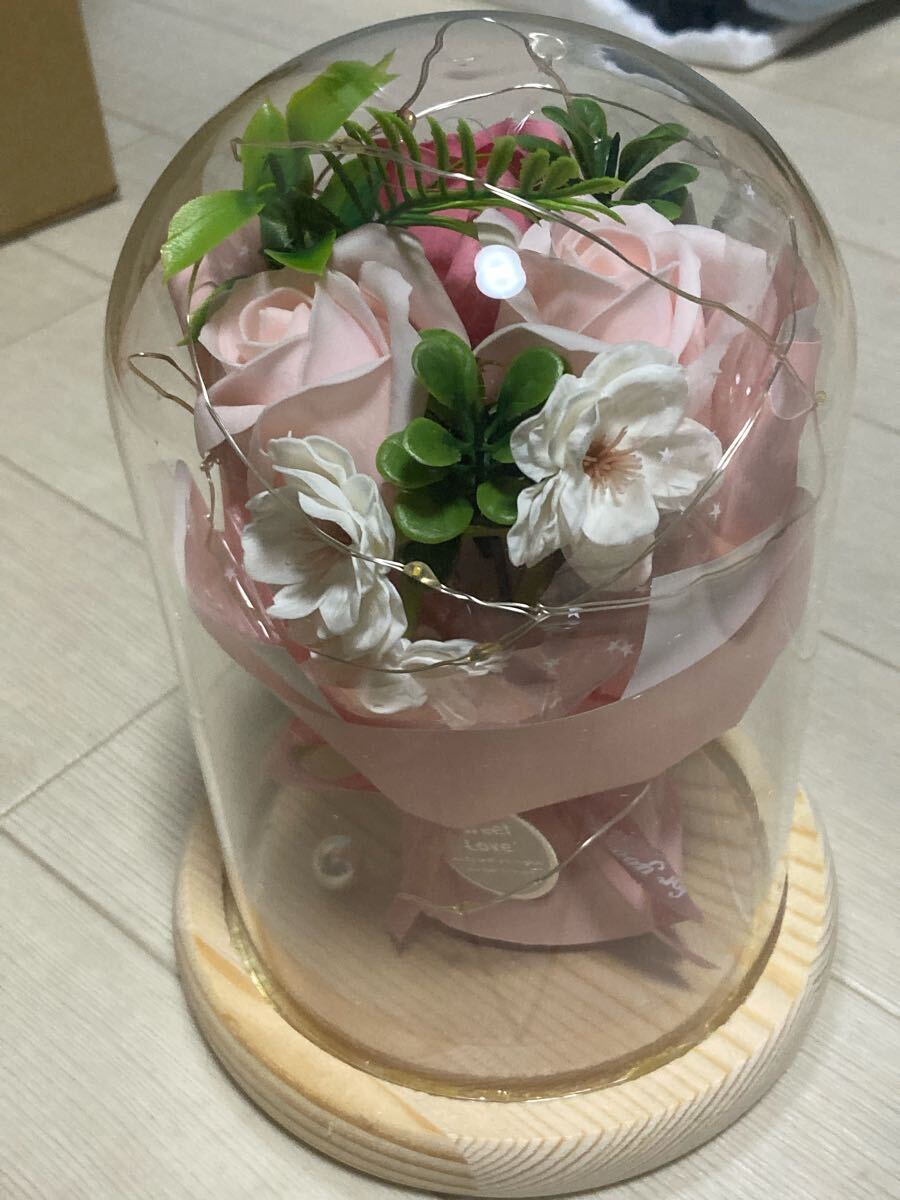 ソープフラワー(石鹸で作られた花)の花束にLEDライトを巻き付けただけの作りですのでそんなに電力は使わないと思いますがどのくらい光り続けるのかは計測していないので分かりません。