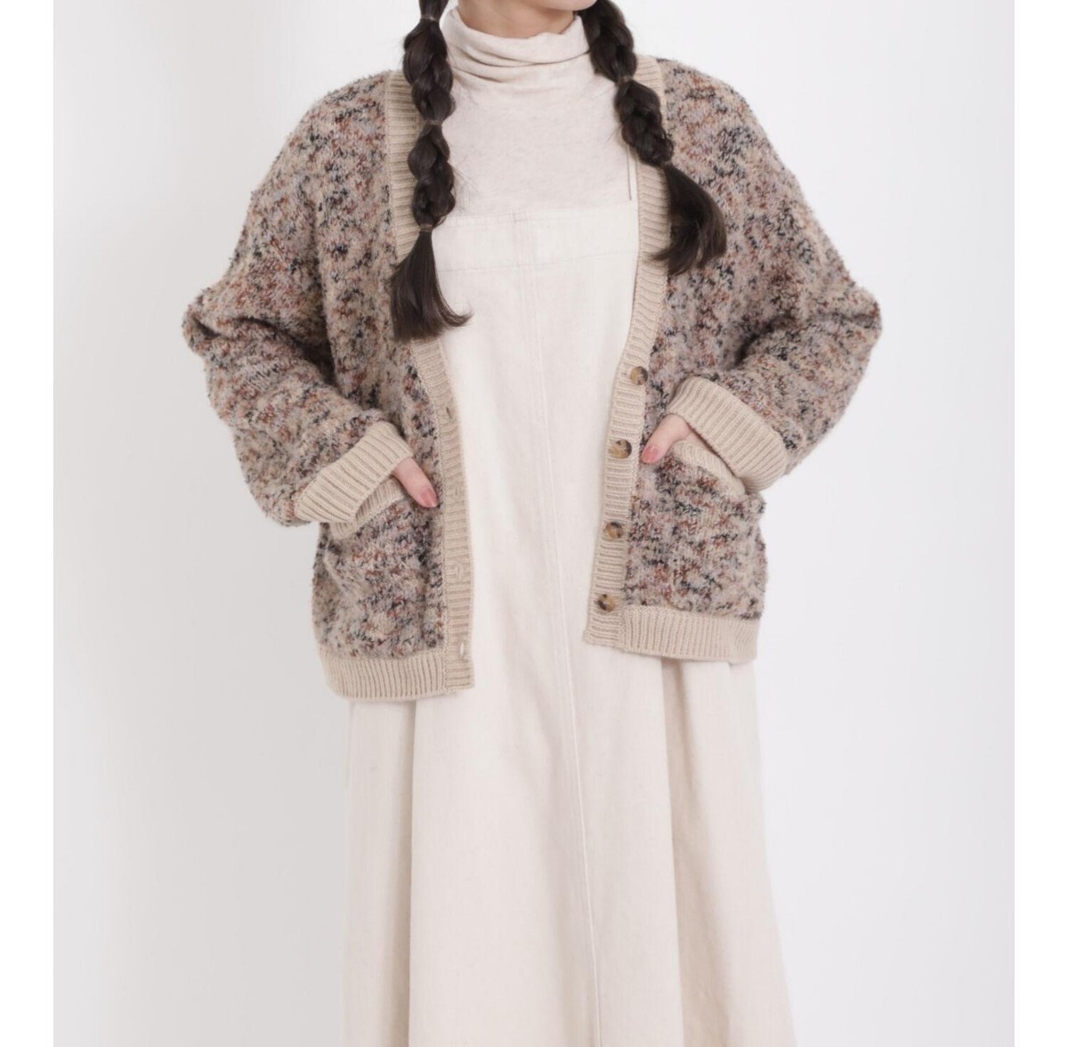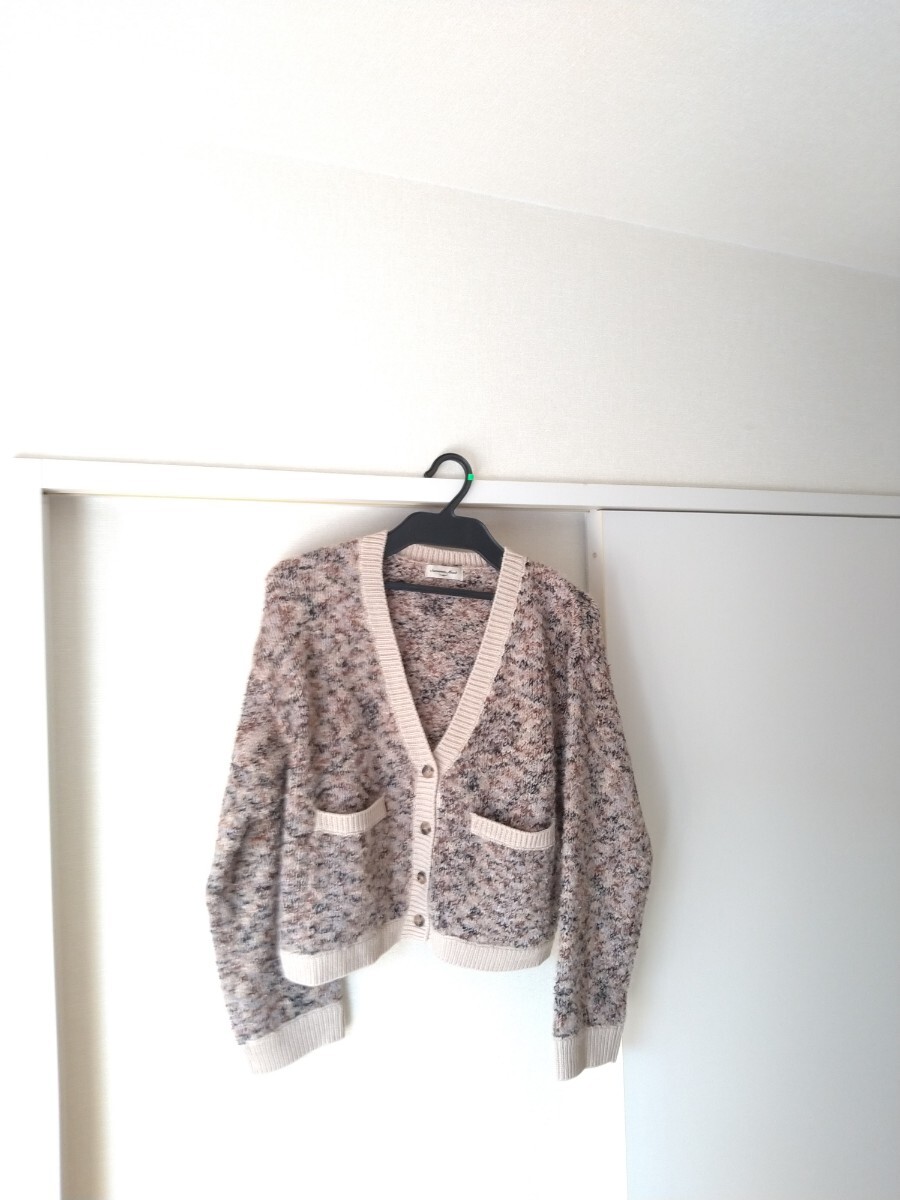 色々な色が混ざってインパクトがあるのでコーディネートのポイントになるカーディガンです。