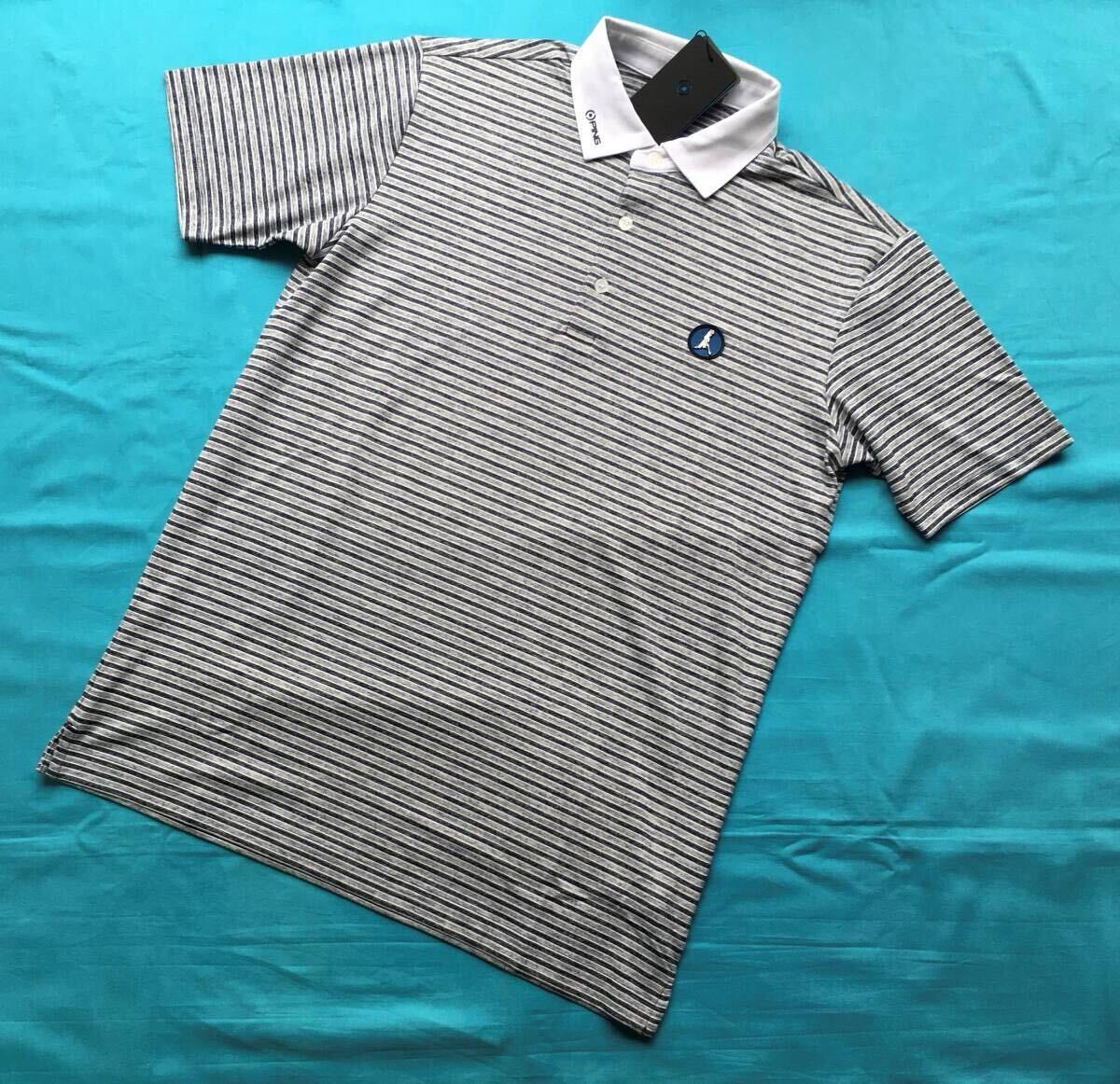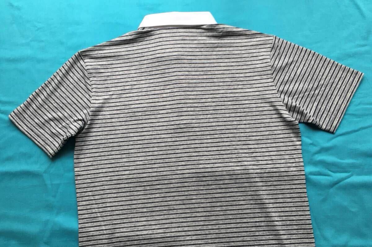 ◎ネイビー系のボーダー柄、ホワイトの襟と左胸のゴルフマンがきまってます。薄手でドライ感のある素材。