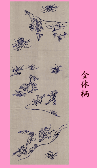 | 宮染手拭いです。 この宮染手拭い(てぬぐい)は、江戸末期の頃、真岡木綿が盛んになり、 その木綿地を染めるために田川沿いに染物職人が集まり 半纏等を染めるようになったのが始まりです。 その後、注染(ちゅうせん)」という技法が生まれ浴衣や手ぬぐいを1枚ずつ 丁寧に染上げていくようになりました。 注染は、型を使い布に防染のりを置き、畳んだ生地の上から染料を注ぐ方法で、 染料を上から下までしみこませる為、 染め上がった生地の両面に柄がつくのが 特徴です。 又、注染で染めた手拭いは吸収性や風通しが良く、 にじみやゆらぎなど独特の風合いが魅力です。 是非、この機会に職人さんの技をお手にとって感じて頂ければ幸いです。 てぬぐいとしてお使い頂くだけでなく、額に入れたり掛け軸にしたりと アレンジしてみてはいかがでしょうか? 子供用甚平やランチョンマットなどを作られてもいいですね。 ★絵柄の説明★ 【鳥獣戯画(ちょうじゅうぎが)】 鳥獣戯画は今から850年程前の平安時代の終わりに描かれた 全4巻からなる『鳥獣人物戯画』甲巻の通称名で国宝の絵巻物です。 墨一色、抑揚のある線と濃淡だけでのびのびと見事な筆運びにて 気品溢れる作品となっており、まるで人間の様に生き生きと躍動した 蛙と兎が相撲をとって遊んでいる風景が描かれています。 大きさが違う兎と蛙が違和感がないばかりかまるで本物の生き物の様に 見えるのは、ちゃんと動物を観察したうえで骨格も手足も毛並みも ほぼ正確に しっかりと描かれているからです。 兎は耳の先だけがぽちんと黒く描かれていますが、 それは、白い冬毛の北国の野うさぎを表現されています。 又、蛙はトノサマガエルを描いたもので、まだらな模様があり、 いく筋か背中が盛り上がっています。 そんな兎と蛙はどれも勢いがあり絵がとまっていないばかりか、 どの表情も全て笑っており、和気あいあいとした遊びである事が見て 取れ、 言葉だけではなく絵の力を使って物語りを語っている作品にて 十二世紀という大昔に、 これほど自由闊達なものはどこにも見つかっていない為、 幾多の変転や火災の度に救い出し、今も大切に保存されてきたからこそ 国宝だけでなく人類の宝となっている貴重な作品です。 ★手拭いの由来と手拭いの両端について★ 手拭いは江戸時代の木綿職人によって、染め上がった生地を消費者の要望に 応じて、 手拭いサイズにカットして販売された事が発端にて、 タオル代わりや赤ちゃんのオムツ代わりとしてなど 色々にアレンジされ使用されていたので、 毎日の生活には欠かせないものとなっていました。 そこで重要視されたのは、 縫い糸などにより肌に触れた時の風合いを損ねない様にする事 (縫い目が赤ちゃんの肌や顔を拭いた時の肌を縫製によって 摩って傷つけない様にする事)、 そして着物の半襟や緊急時には包帯や草履の鼻緒など様々なものに すぐさま応用出来る様、 今日までの長い歴史を通して、現在もその風習を活かし縫製加工なしにて 製造されております。 又、切れっぱなしの状態にする事で布に水がたまらず、 水切れが良くなりますので、 すぐに乾きますし、 それにより細菌が繁殖しにくい為、清潔な状態を保つことができますので、 その利点を損なわない様、当店にて販売致しております手拭いは、 裁断されたまま(切りっぱなし)の状態にての販売となります。 尚、手拭いは使用する(洗う)事によって、段々布目がしまってきますので、 自然にほづれはおさまってきます。 ★サイズ★ 約34cm×90cm ★素材★ 綿100% ★包装等★ 贈答品としてご使用されたい方は、落札後ご連絡下さい。 包装・のしを無料にて承ります。 ポリ袋に入っておりますので、箱はございません。 今後も続々出品予定です!!お楽しみに…。 |