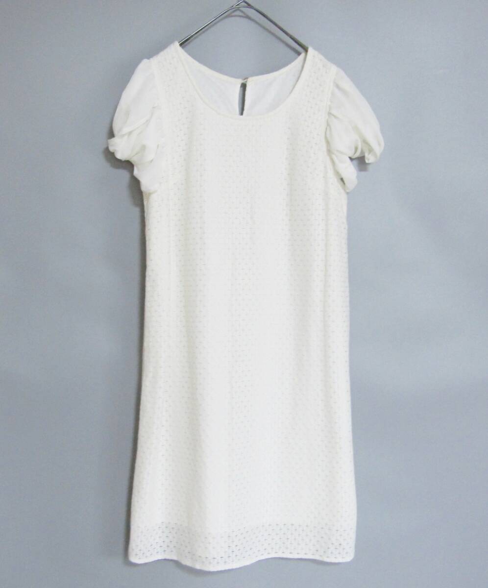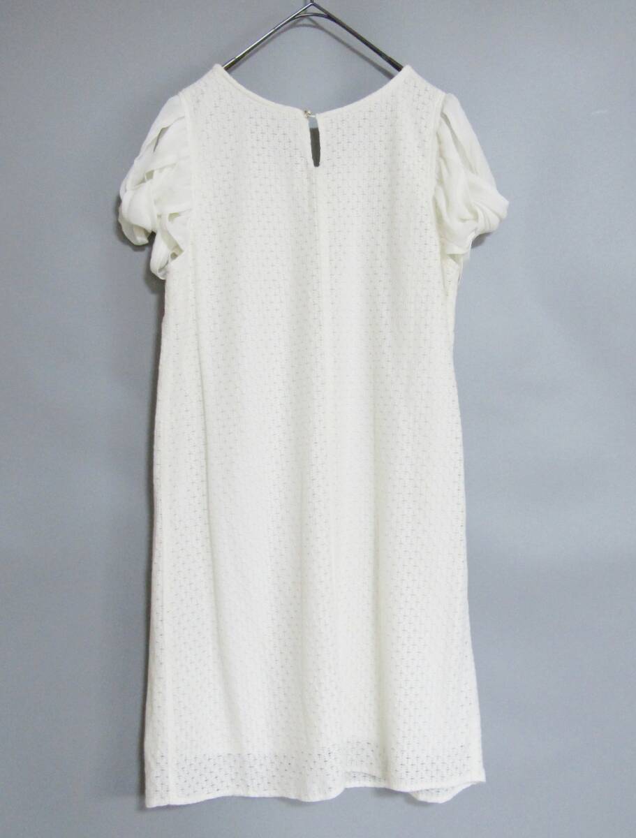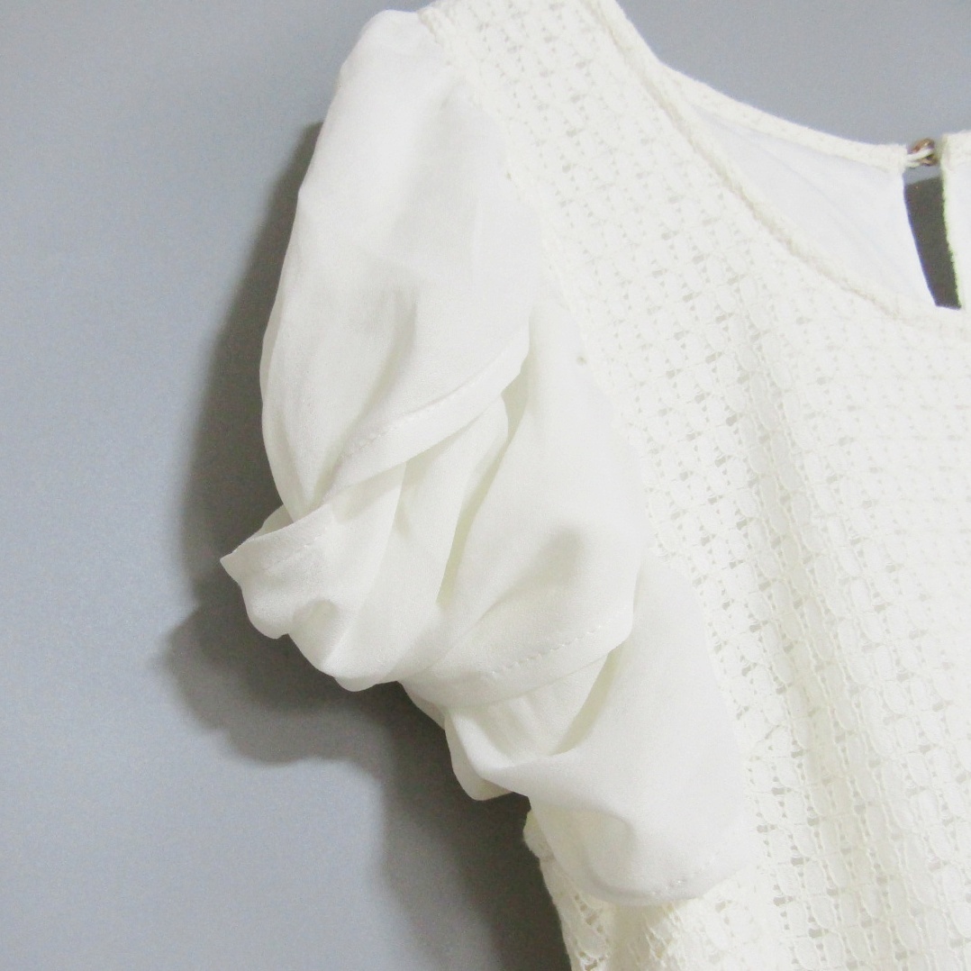 透かし編みデザインのホワイト半袖ワンピース、フリル袖が特徴。