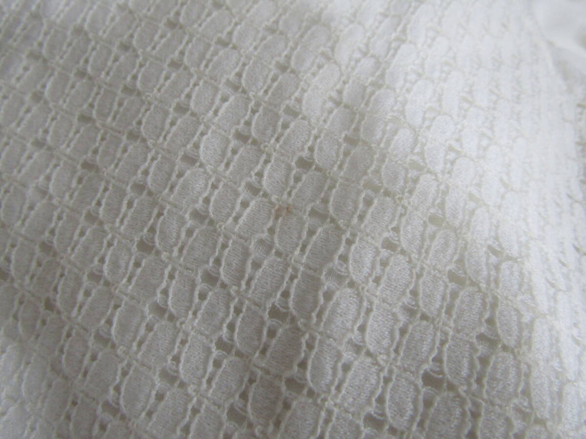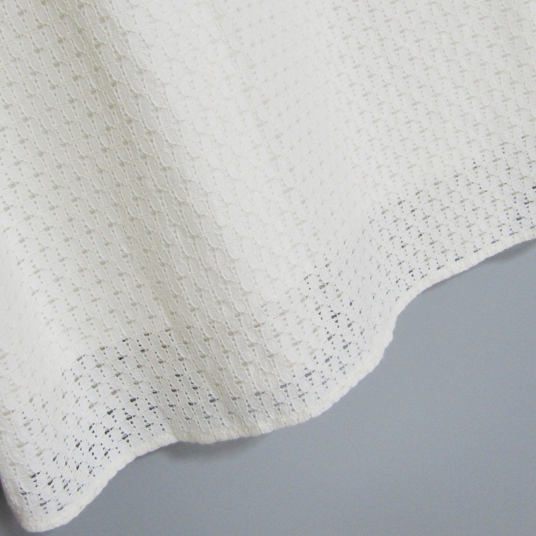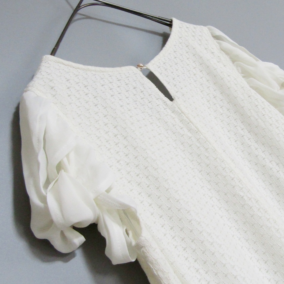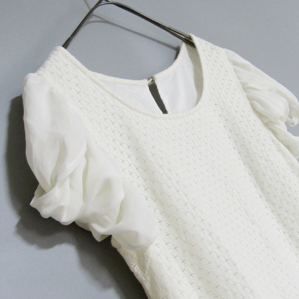 透かし編みデザインのホワイト半袖ワンピース、フリル袖が特徴。