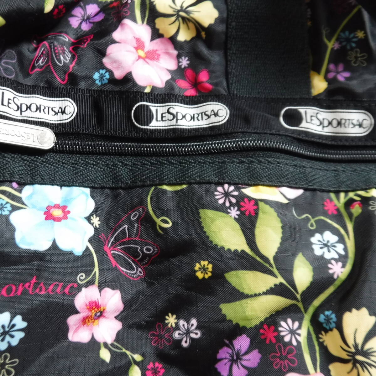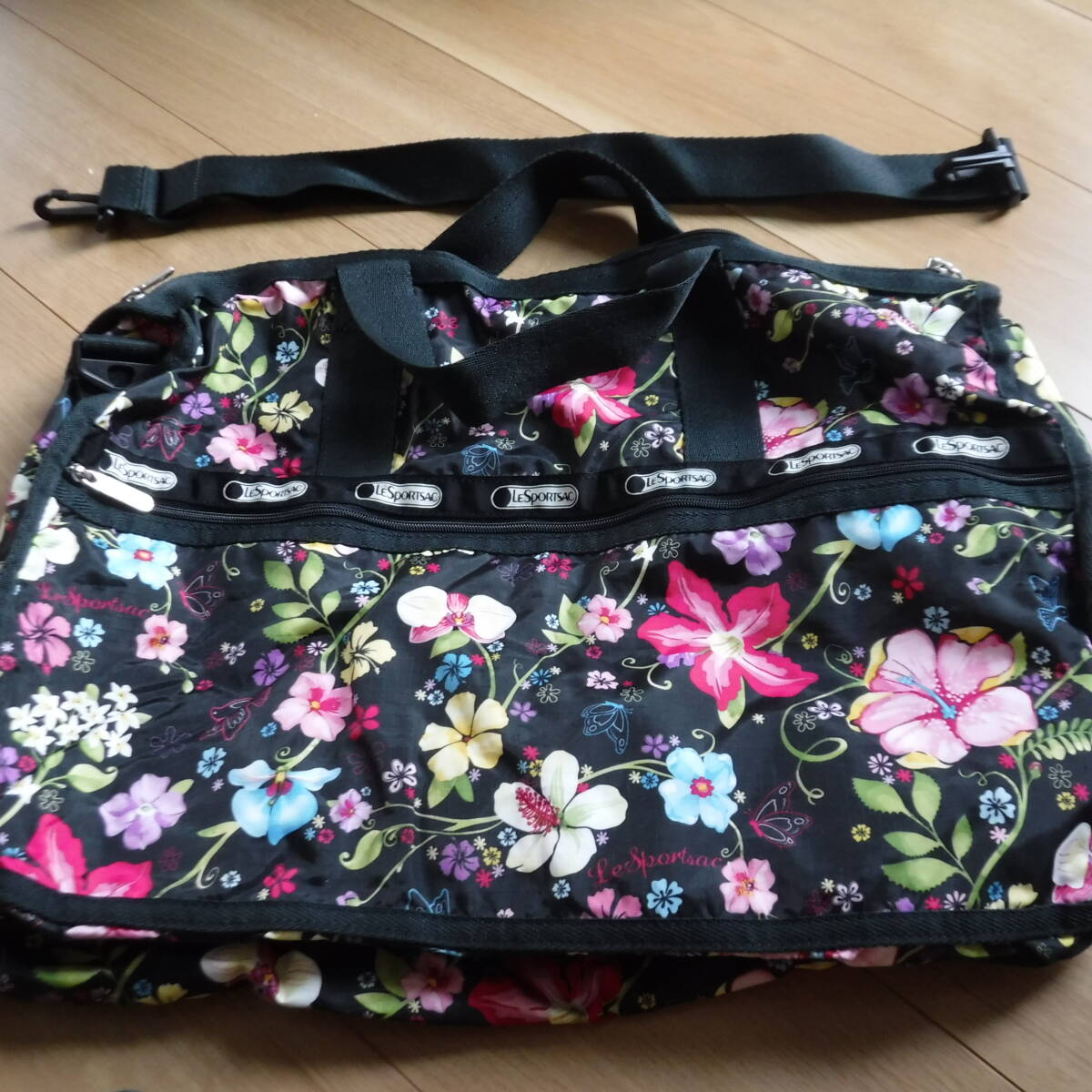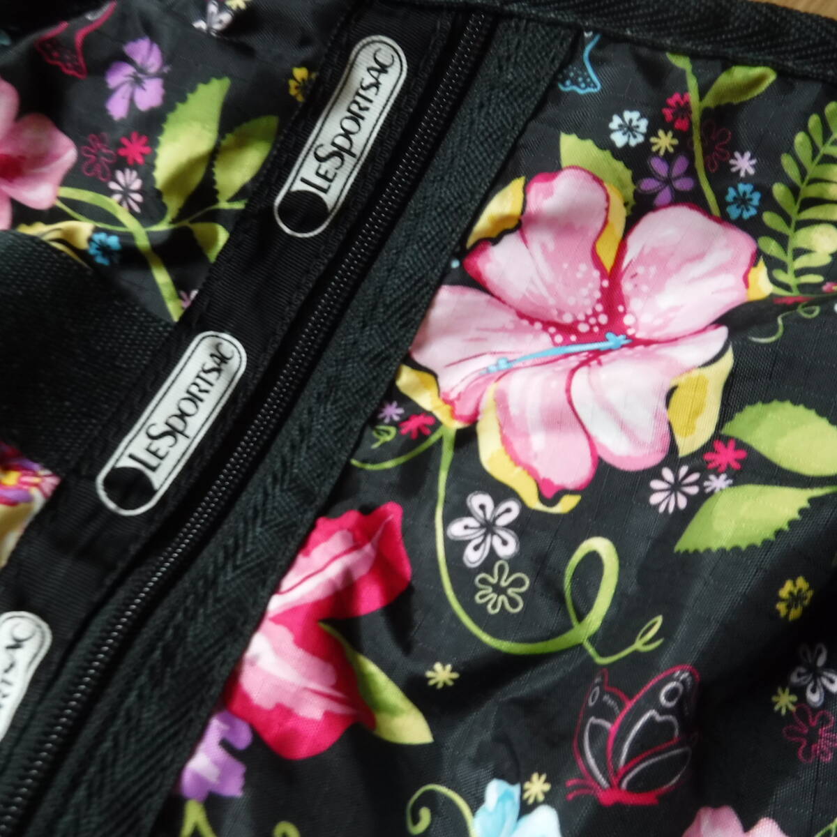 レスポートサックのハワイ・DFS限定トロピカルフローラルのボストンバッグで、サイズは個人寸法で横50縦34マチ23センチ位、トップは両側から開くチャック式(鍵なし)、4面全てにチャック式大きめポケットがあり便利☆取り外し&長さ調節可能なショルダーベルトが付いているので、手で持ったり肩から掛けたり斜め掛けにもできると思います♪トロピカルフローラル柄は何年も前にハワイのDFS限定で販売されており、黒地にカラフルなハワイアンフラワーが描かれていて、内側も黒なので汚れが目立ちにくく使いやすいです☆目立つ汚れはありませんが、ロゴの擦れが数か所あります。長期個人保管につき、金具のくすみや傷、多少の汚れや擦れ、シワなどある場合がありますので、ご理解ある方、ノークレームノーリターンでお願いします!レスポのボストンは結構なお値段がします。