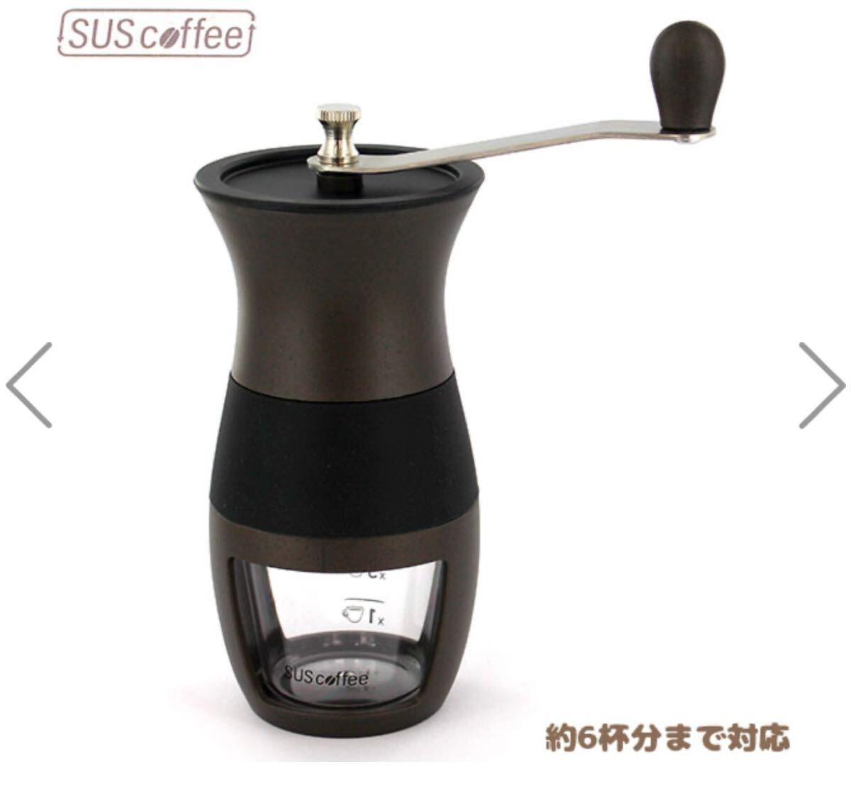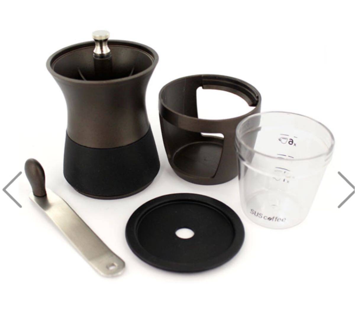 SUS coffee サスコーヒー コーヒーミル・・・廃棄されるコーヒーカスを本体に使用したコーヒーミル。