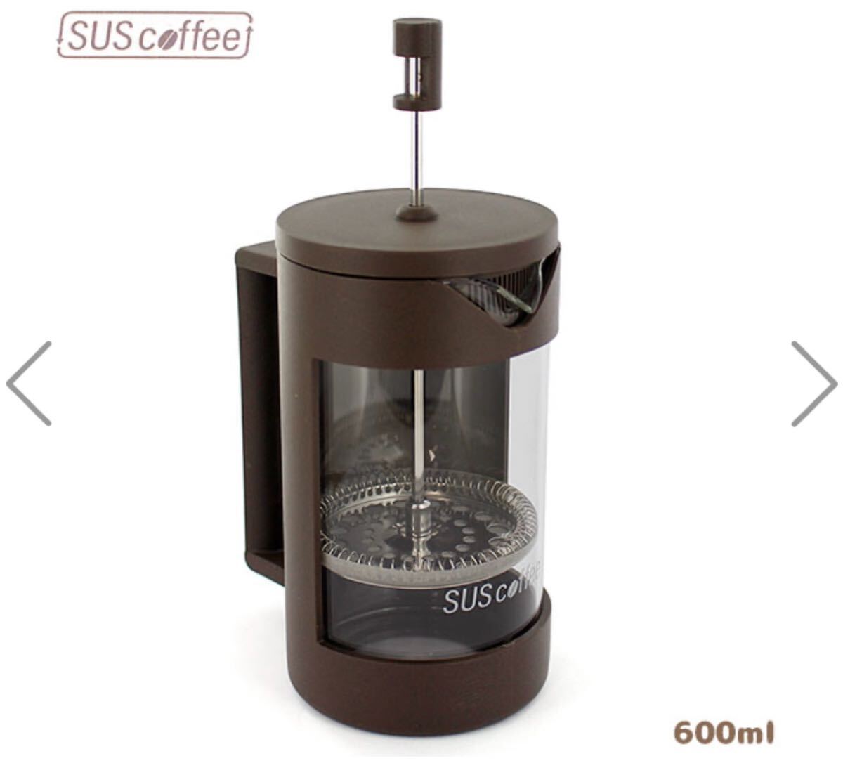SUS coffee サスコーヒー フレンチプレス 600ml ・・・コーヒーの粉とお湯を入れるだけで、簡単に美味しいコーヒーが淹れられるフレンチプレス。蓋と外側にコーヒーかす素材を使用しプラスチックを削減したサステナブルな商品です。