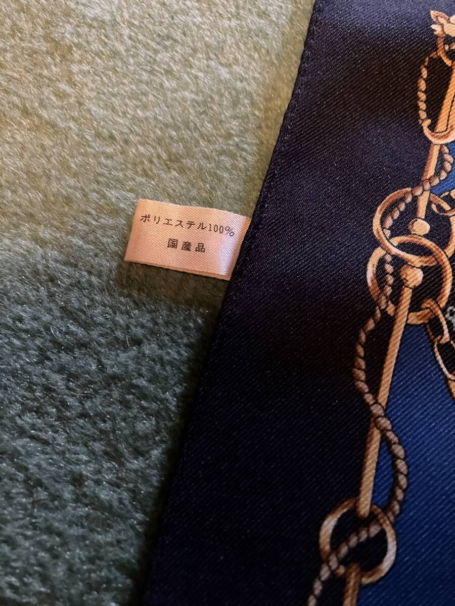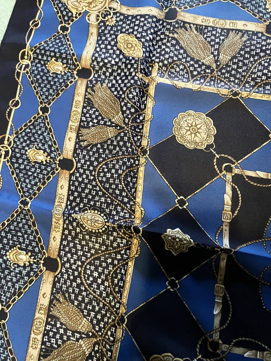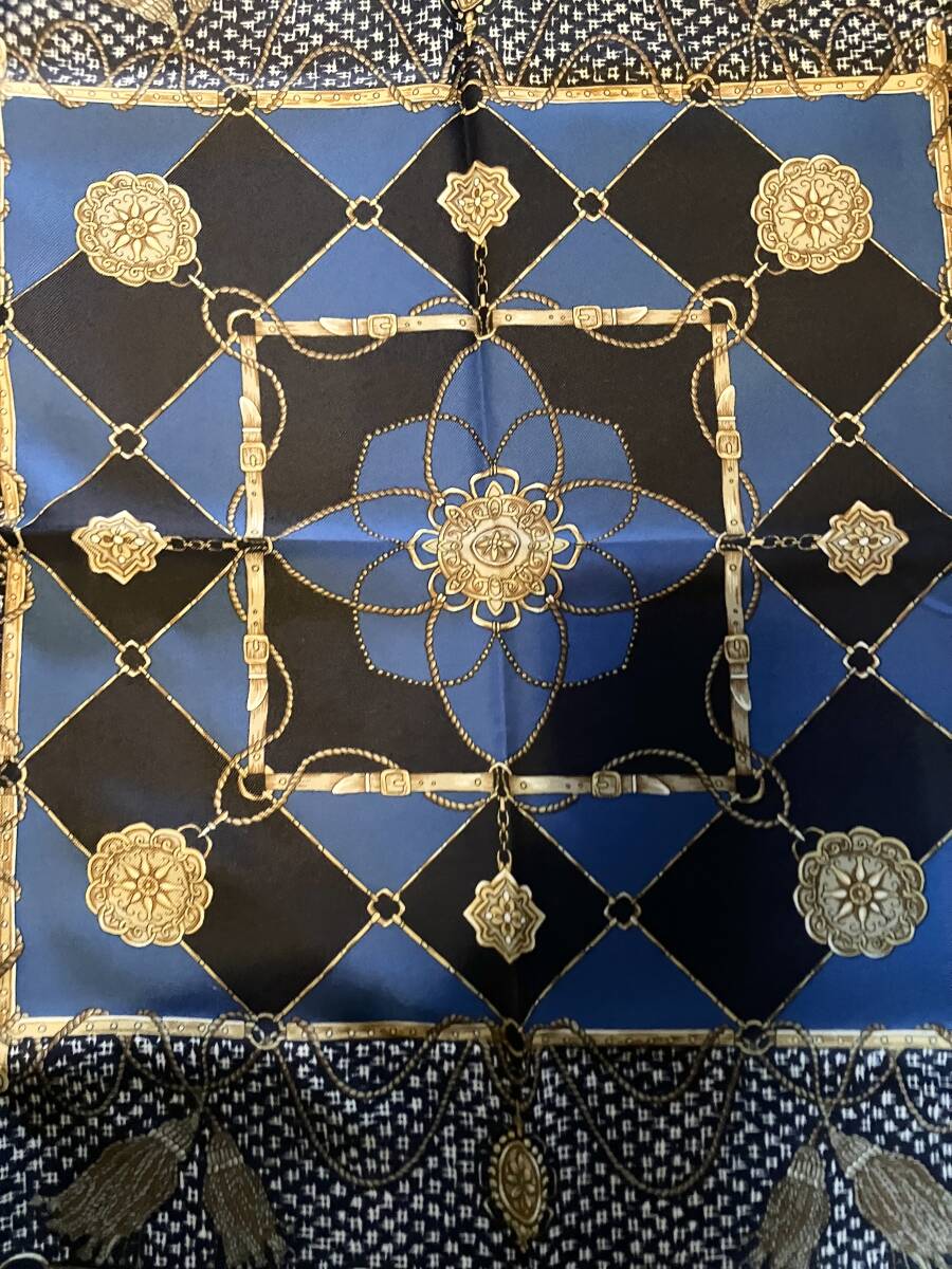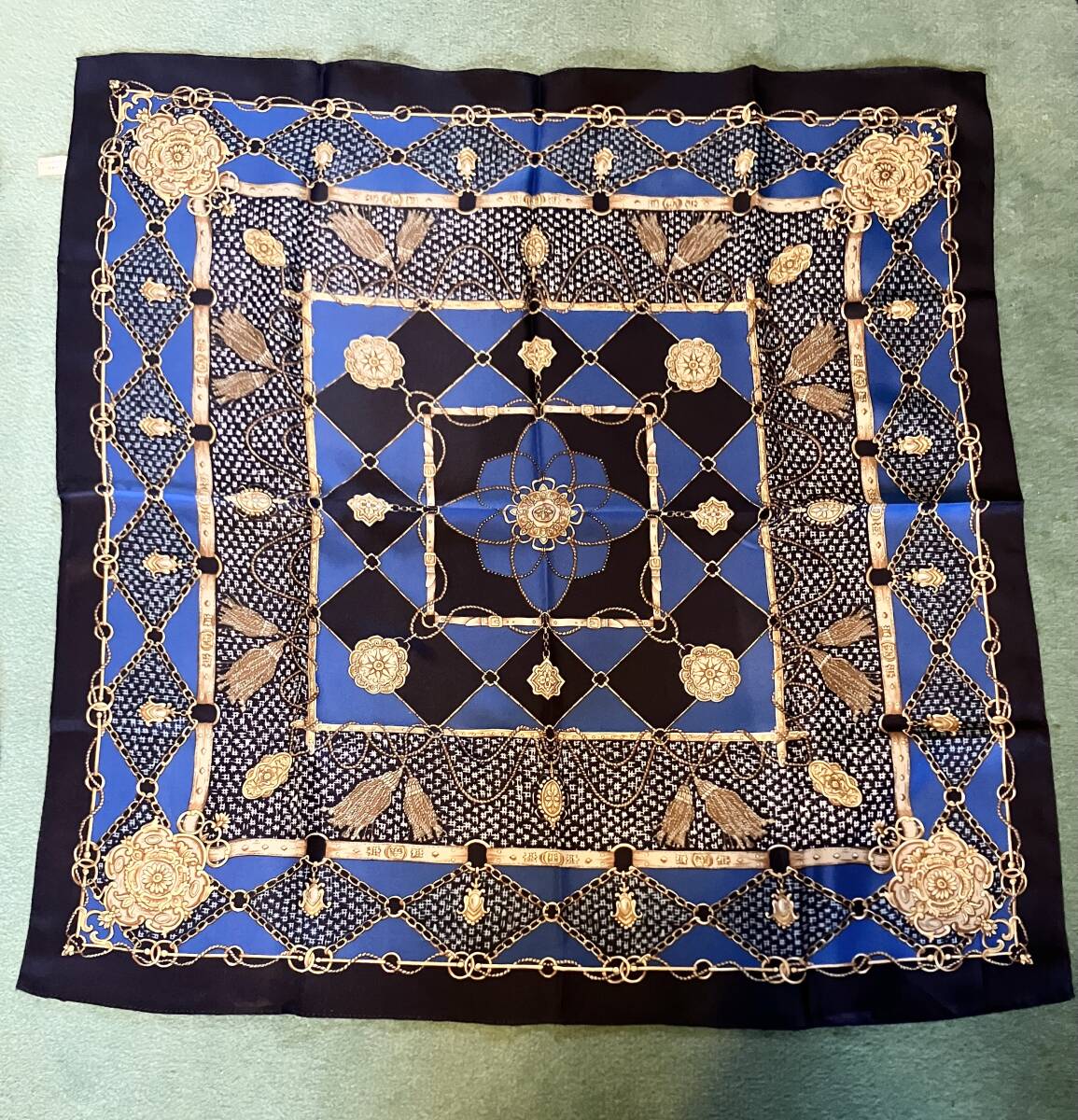 青と黒のシルク風スカーフ、装飾的な花とチェーンの模様が特徴。
