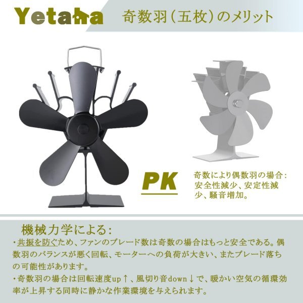 【細いブレード5枚】改良版ストーブファンは5つの細いブレードデザインを使用しており、他のストーブファンに比べて、より効率的に送風でき、燃焼によって生成された暖かい空気を素早く循環させて、ストーブの熱を最大限に使えます。