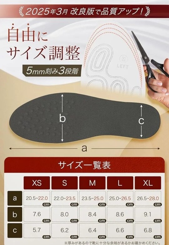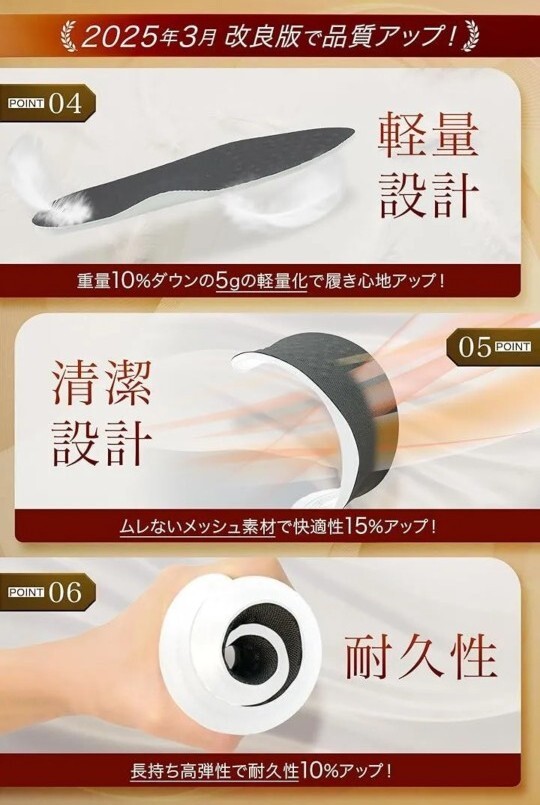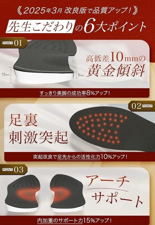 「改良版」入れるだけで真っすぐ脚に。お客様の声を元に、(1)高低差10mmですっきり美脚成功率8%UP、(2)足裏刺激突起で足先活性化力10%UP、(3)アーチサポートのサポート力15%UP、(4)軽量設計で重量10%DOWN、(5)清潔設計で快適性15%UP、(6)耐久設計で耐久性10%UP、に大改良しました。