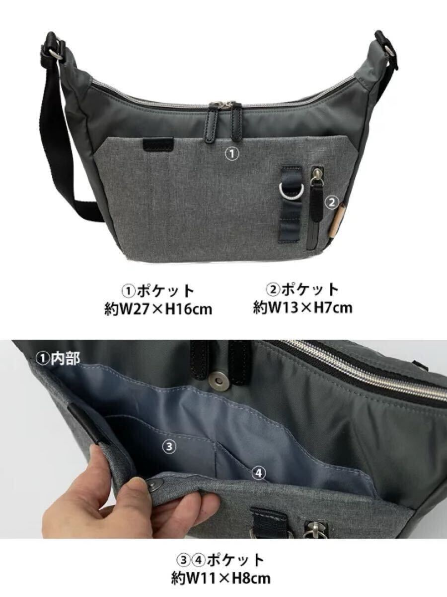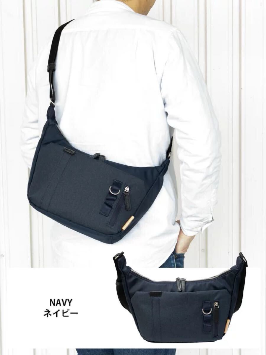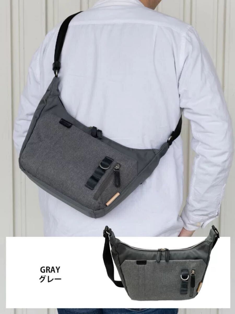 ●ペットボトルや長財布がちょうど入る休日のお出かけにぴったりのショルダーバッグです。人気の杢調ポリを前面ポケット部分に使用しテープをポイントに使ったシンプルでかっこいいデザインになっています。
