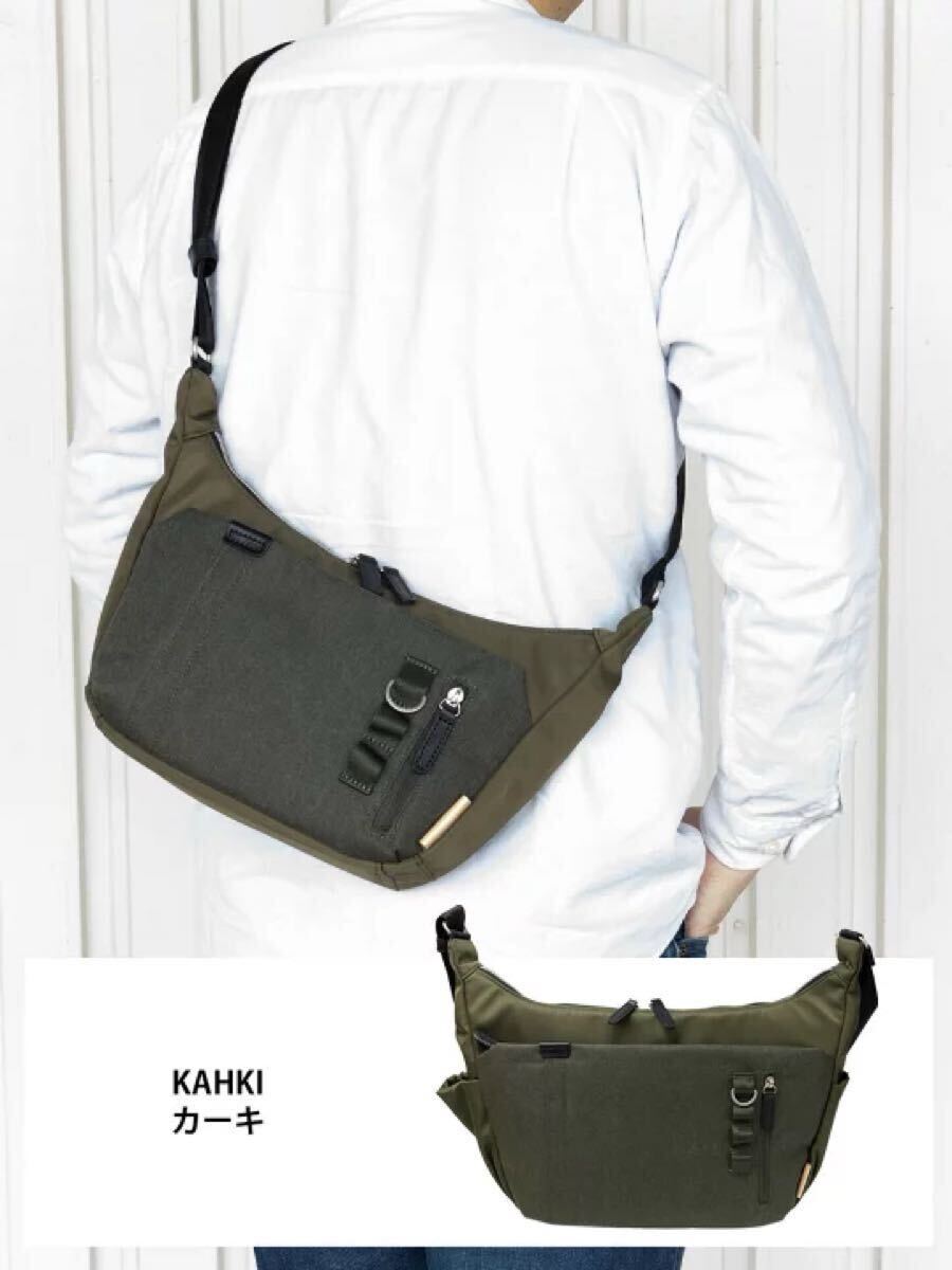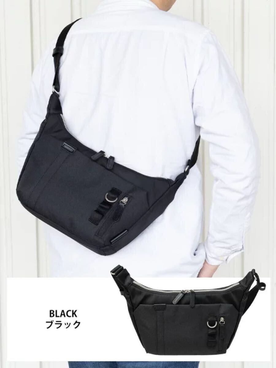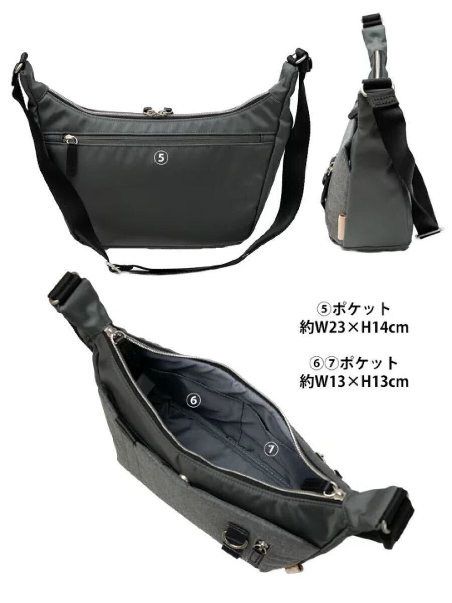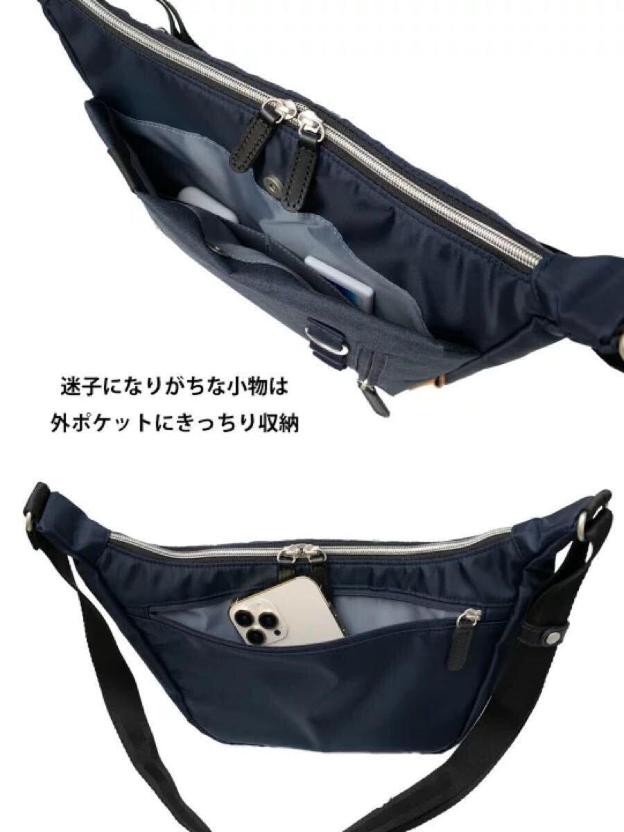 ●ペットボトルや長財布がちょうど入る休日のお出かけにぴったりのショルダーバッグです。人気の杢調ポリを前面ポケット部分に使用しテープをポイントに使ったシンプルでかっこいいデザインになっています。