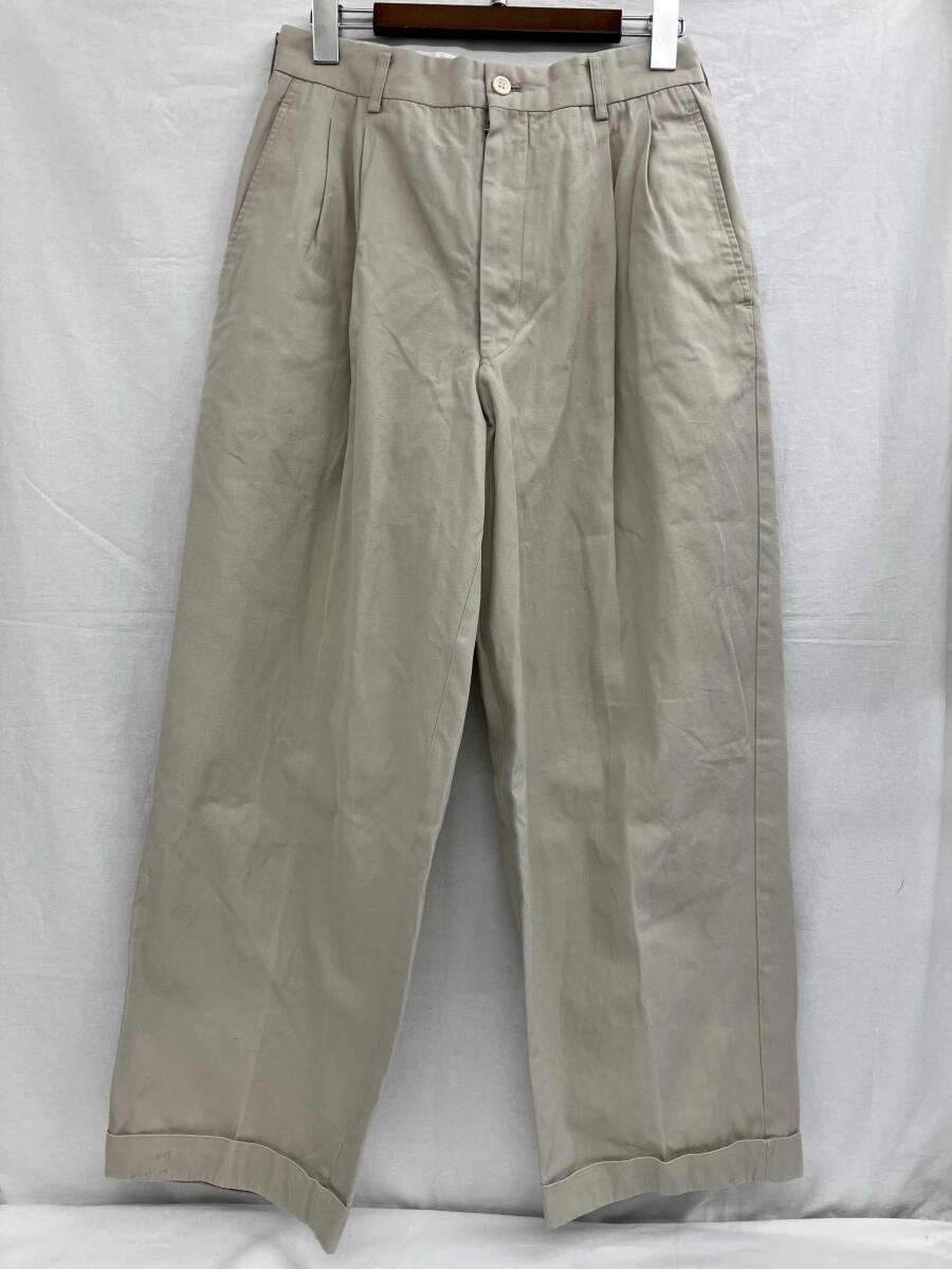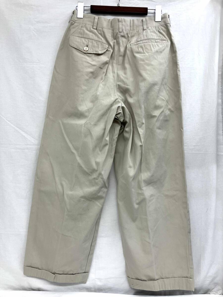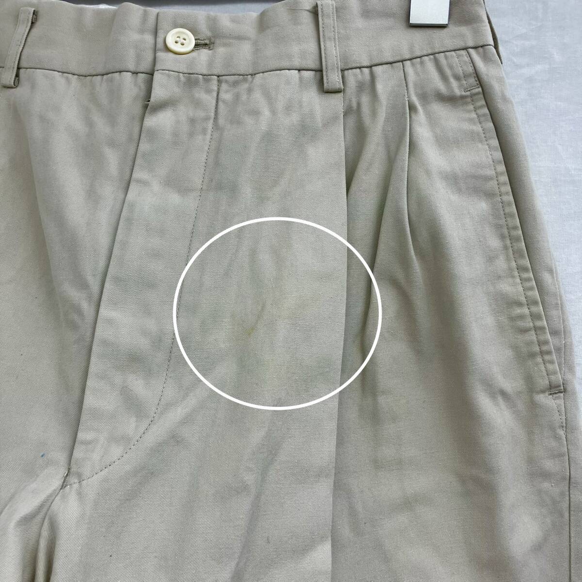 | W34.0H 53.0股上 30.0股下 62.0ワタリ 31.0(cm) 平置き採寸です。 裾の処理が丁寧にされています。 右足裾(すそ)、後ろ側の両裾にヨゴレ、前側ファスナー近くに薄いシミがあります。 |