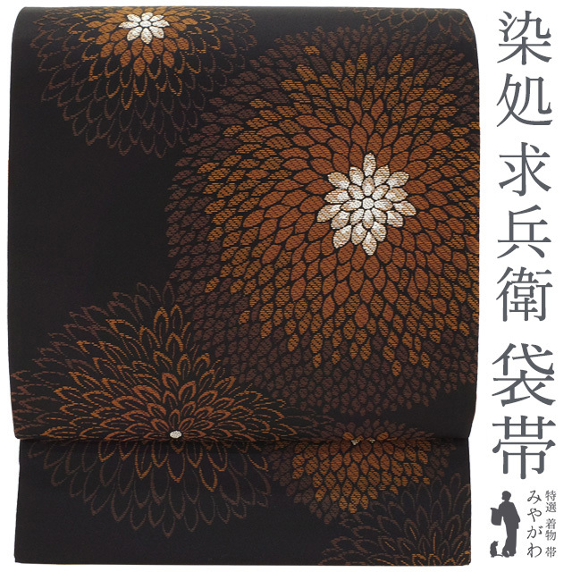 袋帯 未使用 正絹 京都 西陣 大光 染処 求兵衛 黒地 茶 菊 銀糸 kyube collection カジュアル 新古品 仕立て上がり みやがわ sb53761