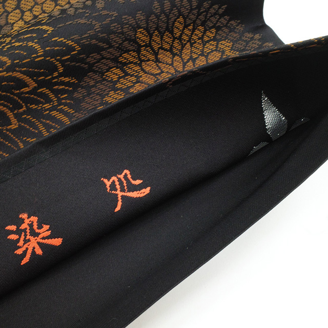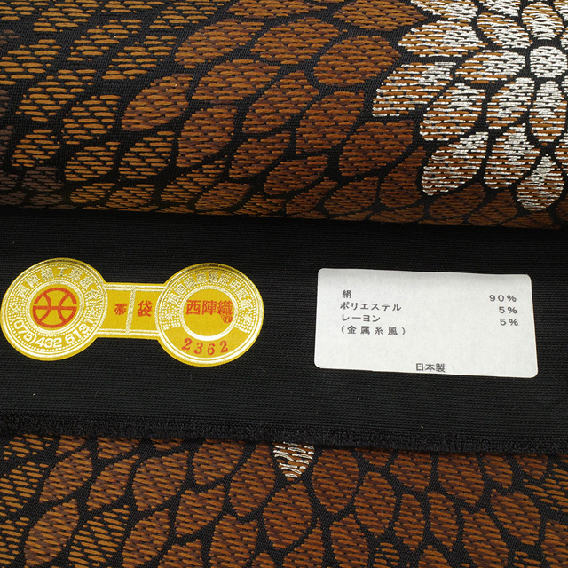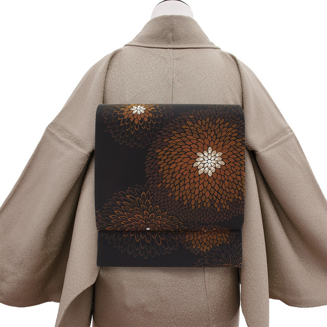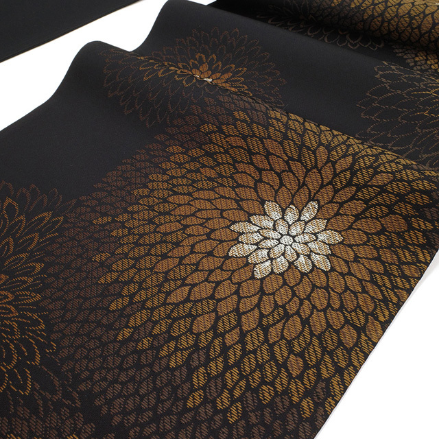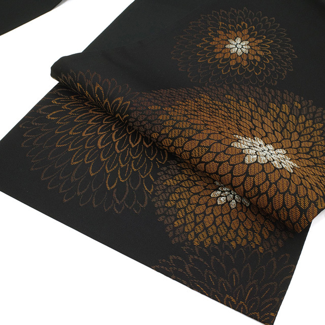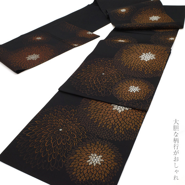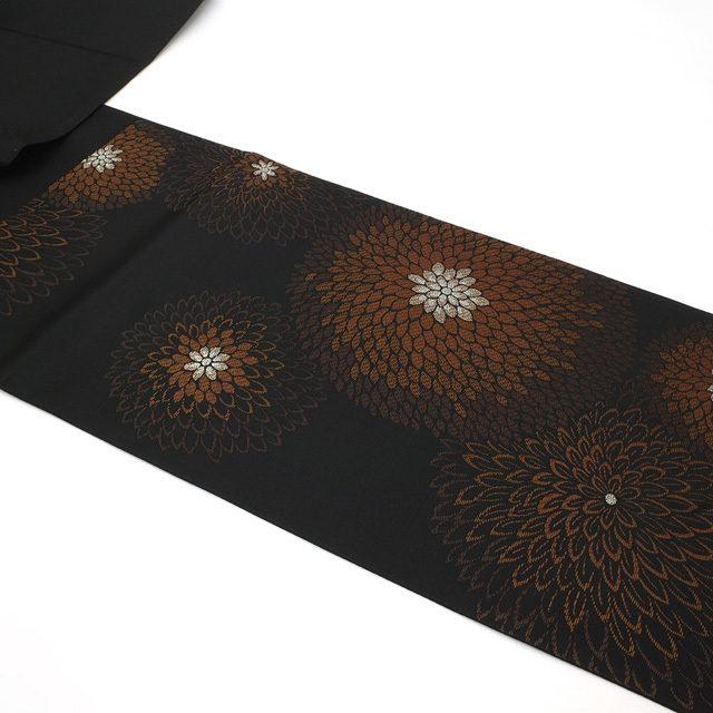こちらの帯は、シックな黒地に茶色系を基調として 菊柄が大胆に織り上げられています。