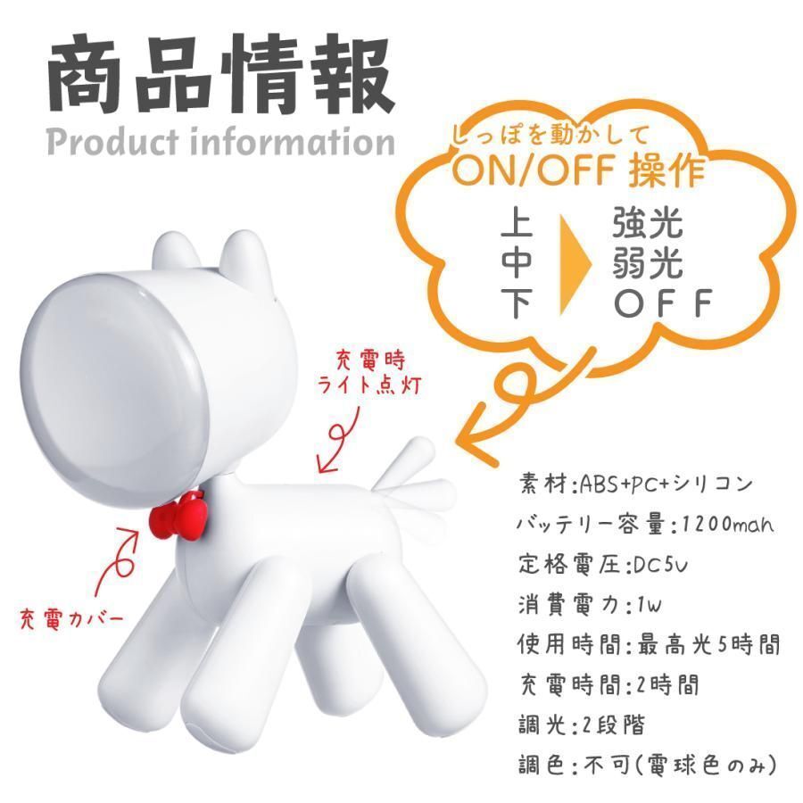 商品紹介 子犬型ナイトランプが新登場♪個性的で可愛いLEDライトです。頭や手足が動くからポーズが自由自在!子供が喜ぶホビー設計♪胸元のリボンは充電カバーキャップとなっており、差し色で可愛いデザイン♪しっぽがスイッチとなっており、ON/OFF・調光がしっぽ一つでできる親切設計。優しい灯りで授乳ライトにも最適。育児で多忙なママをしっかりとサポート♪赤ちゃんが大きくなってもおもちゃとして活躍。勉強や読書にも使えるのでお子様の年齢に合わせて活躍してくれます。足元には滑り止めがついている為、小さなお子様やペットがいるご家庭でも安心してお使い頂けます。