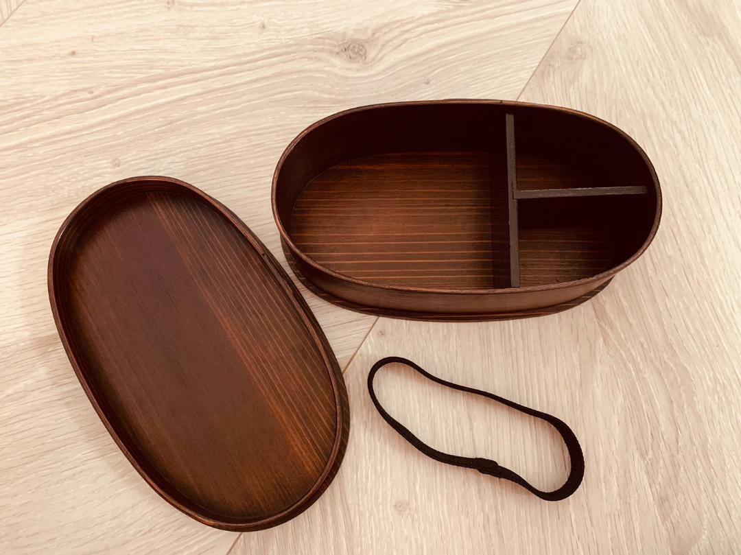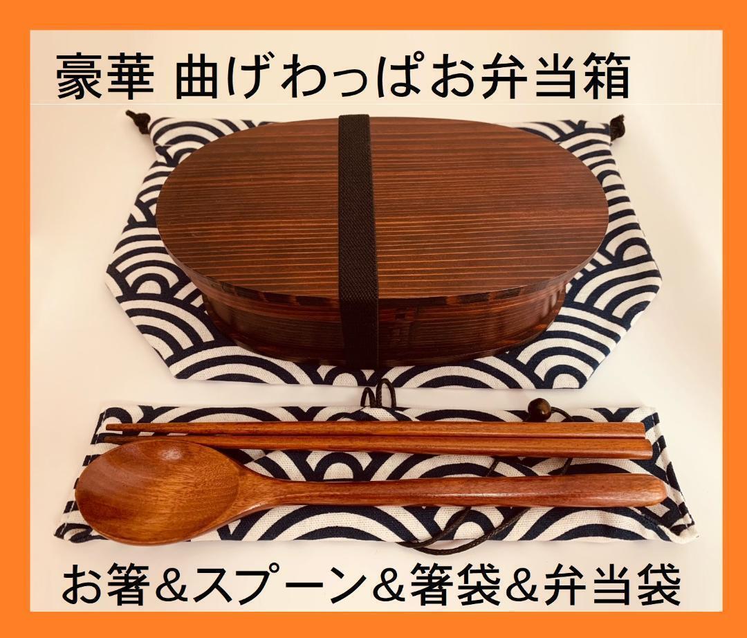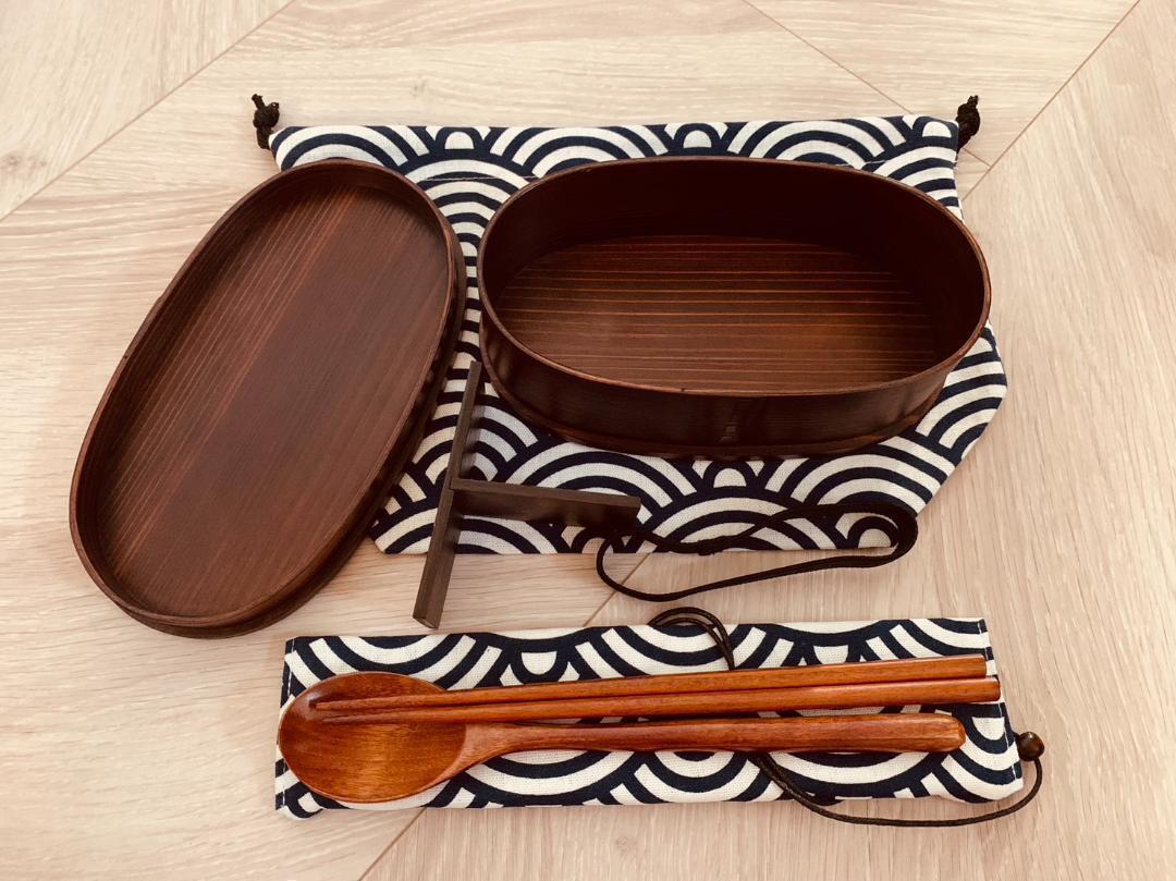日本の伝統工芸曲げわっぱのお弁当箱に天然木のお箸とスプーンにお箸袋とお弁当袋付きでSNS映え間違いなし