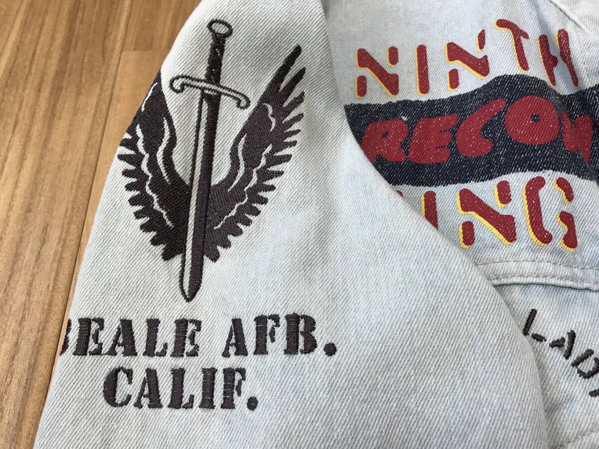 右腕、左胸、右ポケット、背中上、背中の中は刺繍です。他は印刷です。