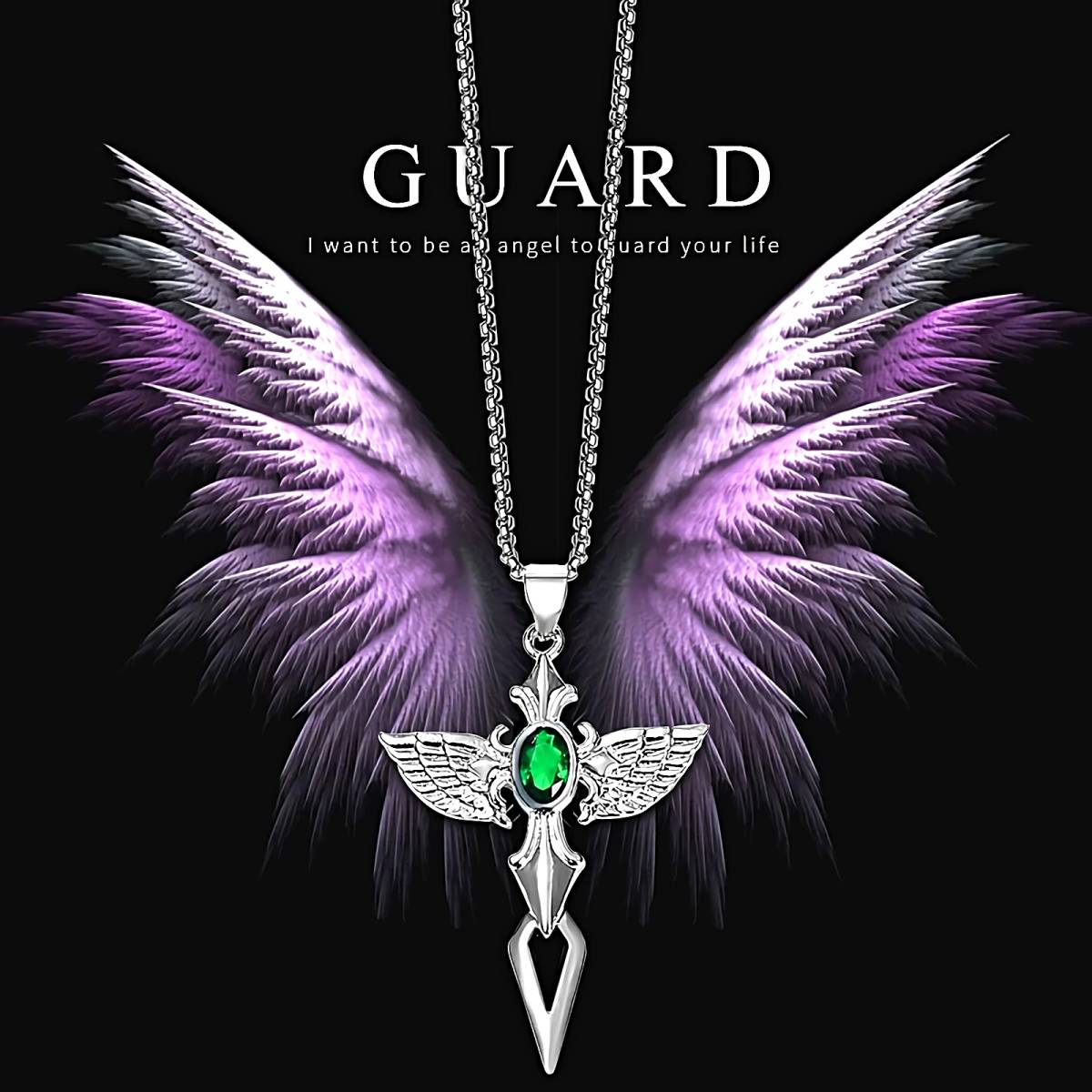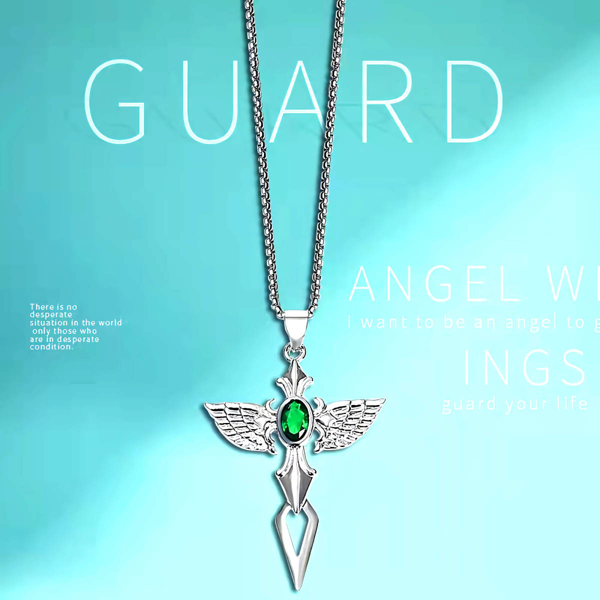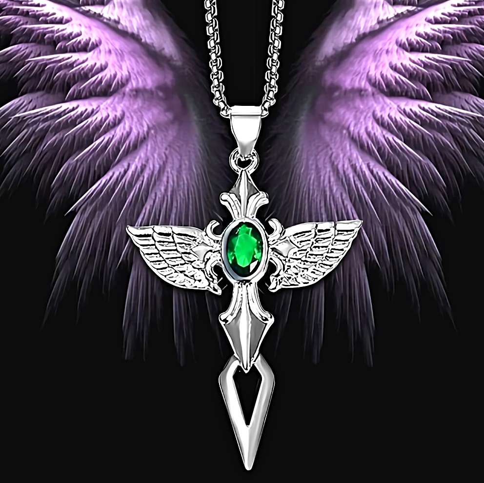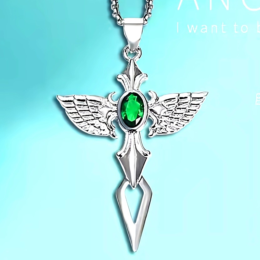 こちら天使の銀翼に剣を模した翠玉エメラルド十字架プラチナ仕上げ925シルバーネックレスです。