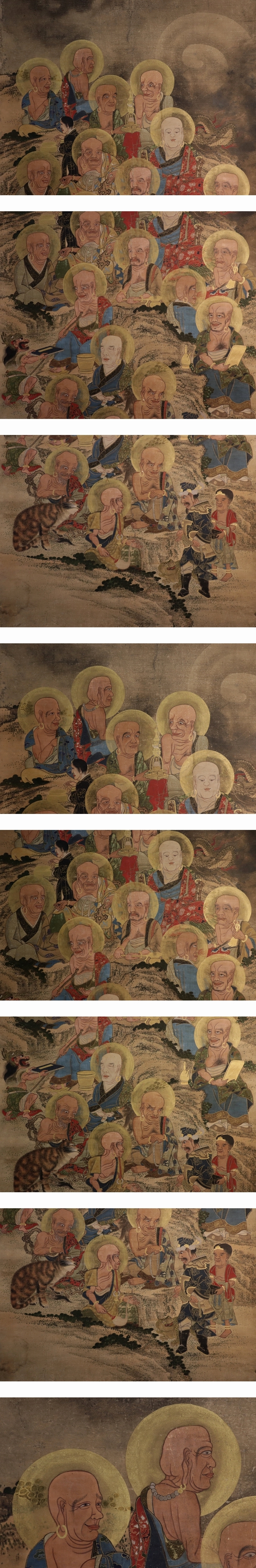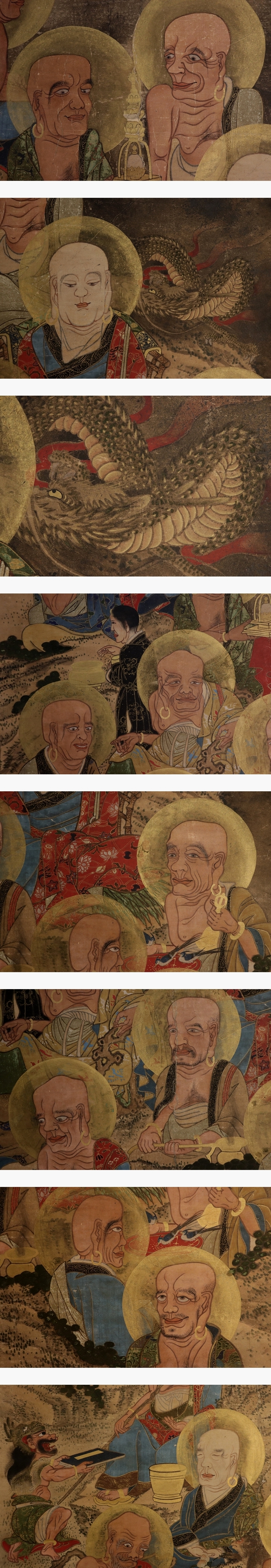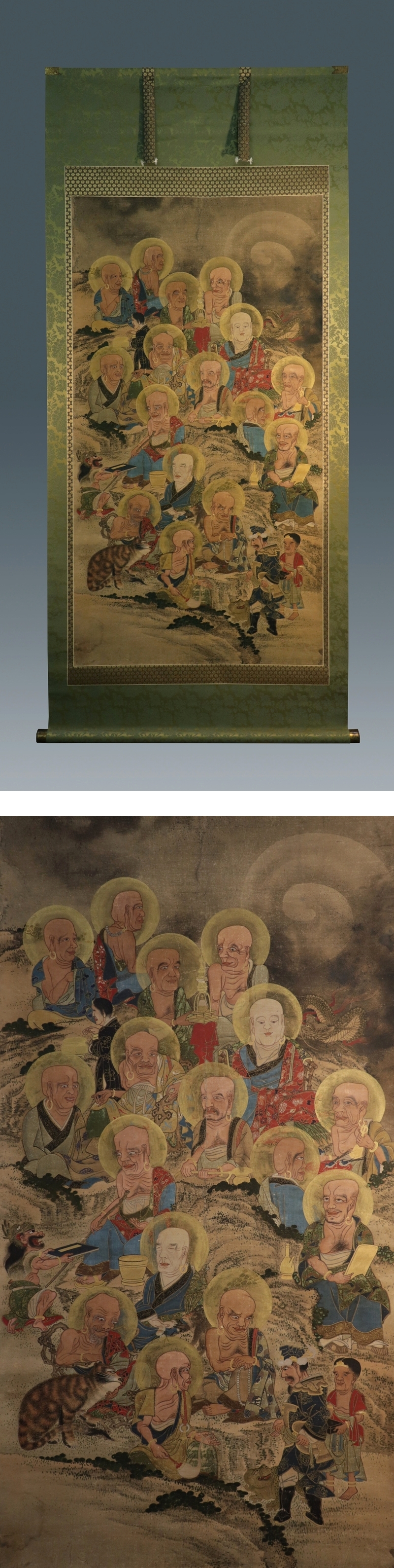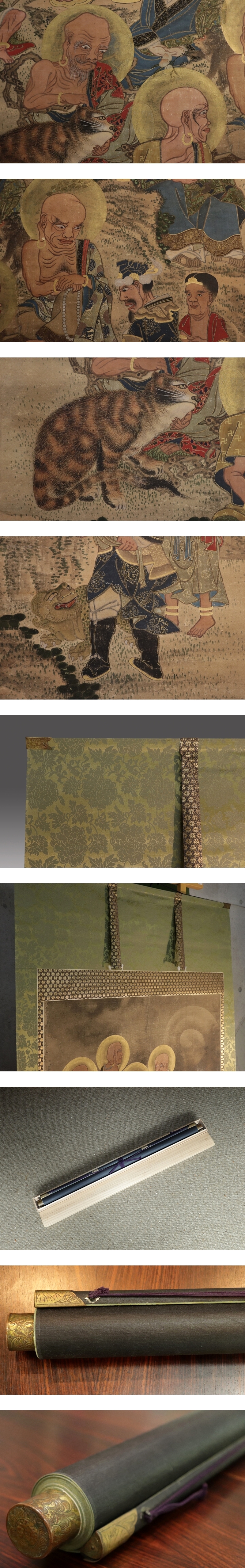 仏画【大幅・十六羅漢】 本紙は、虫食い痕、破れ痕があります。 表装は、染み、軽い皺、軸先と角金具などに変色があります。 【サイズ】 作品 横約77cm×縦約147cm 表装 横約93.5cm×縦約212cm |