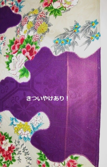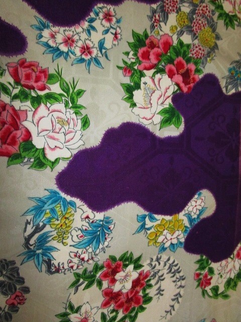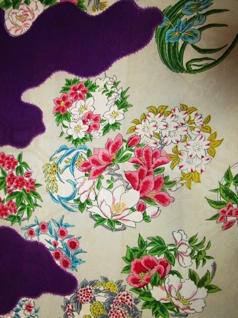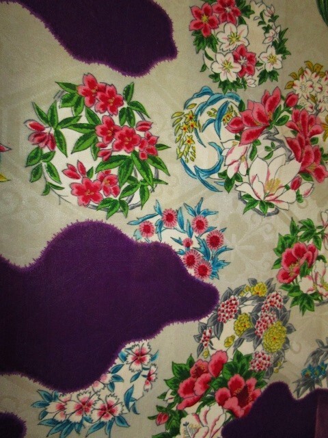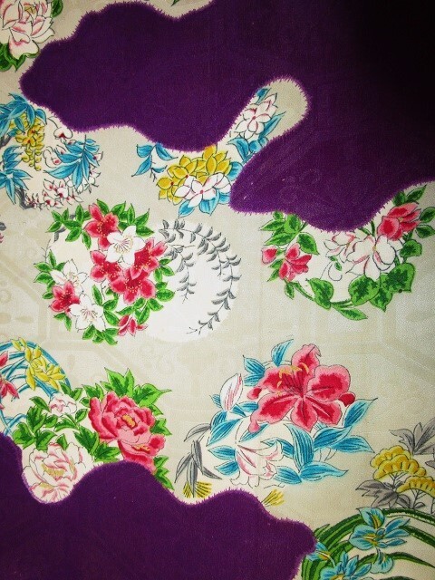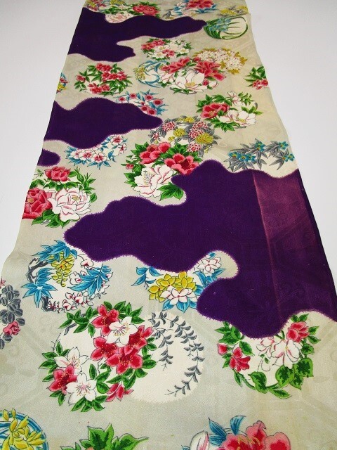 E-64★紫地*薔薇*百合*菖蒲*藤*水仙*ハイビスカス*綸子*古布はぎれ★やけあり!文化人形/一閑張り/吊るし雛/市松人形アンティーク