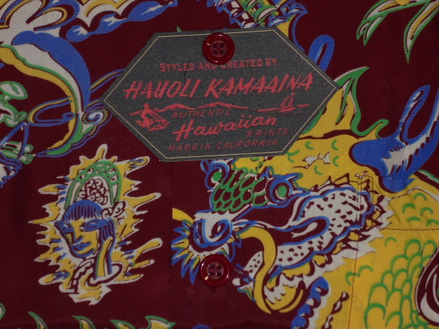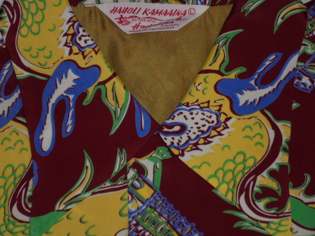 このデザインを手掛けたのは、シカゴの美術学校を卒業後にハワイ大学でも絵を学び、テキスタイルデザイナーとして活躍したムリエル・マーサー。ハワイのテキスタイルの世界では「レディ・ムリエル」と呼ばれ、人気のデザイナーであった。アメリカ本土のブランド、ハウオリ・カマアイナが製作し、抜染の効果が際立つ本作は、空を飛び回る龍をフィラメント・レーヨンの生地にダイナミックに描き、中国の寺院などもモチーフに加えられた非常に珍しいデザインとなっている。