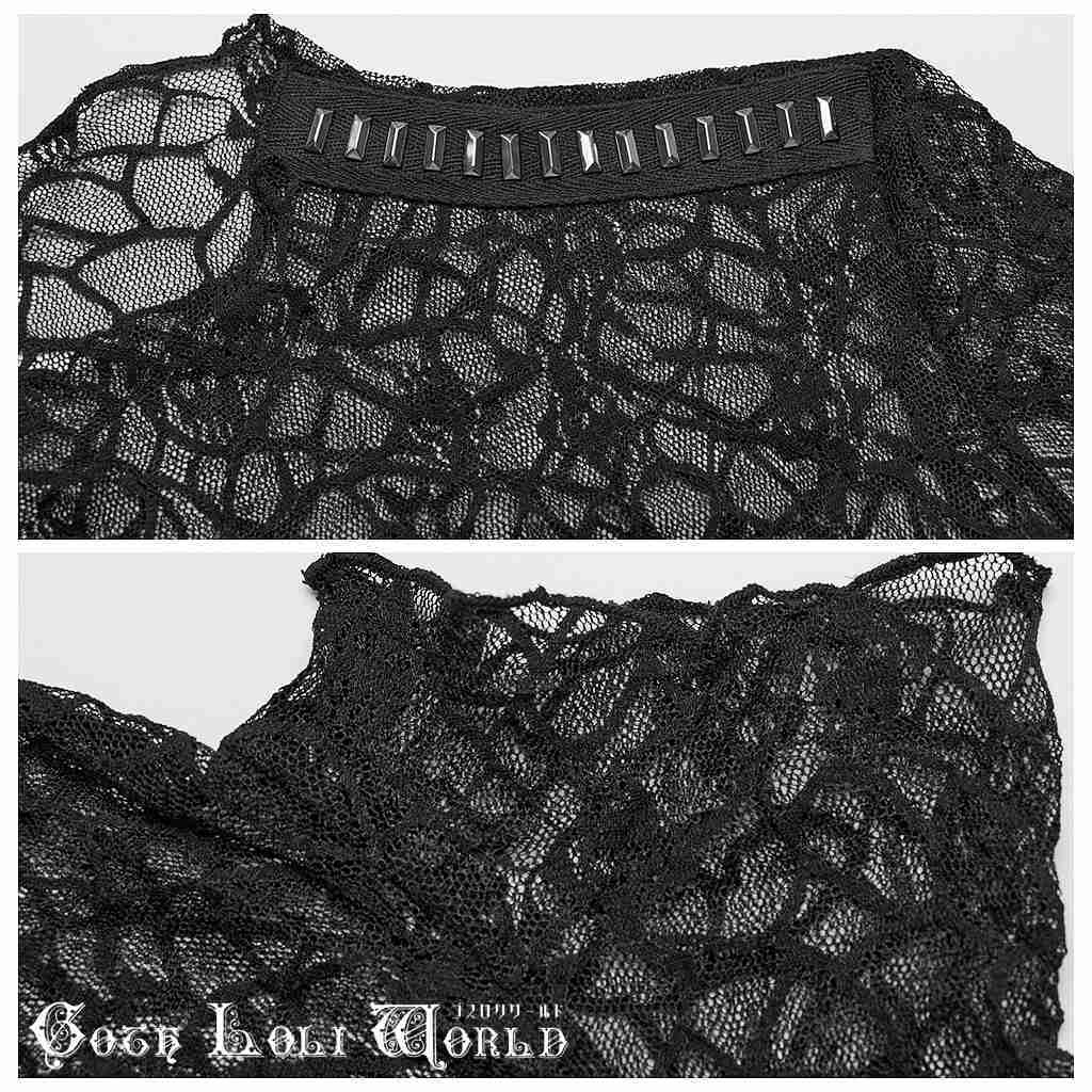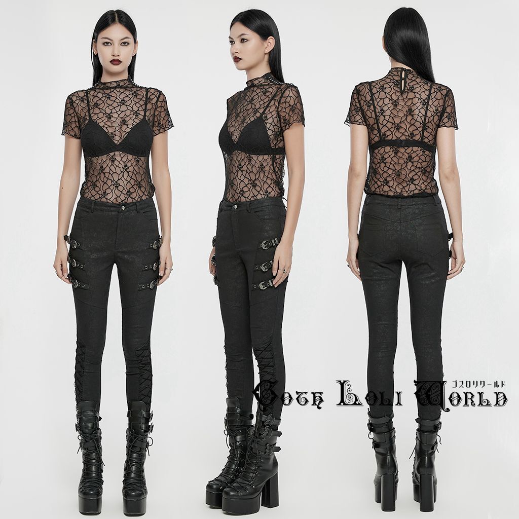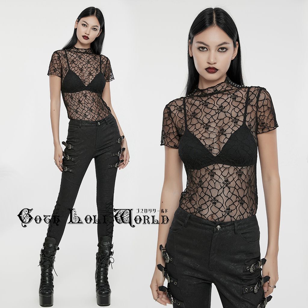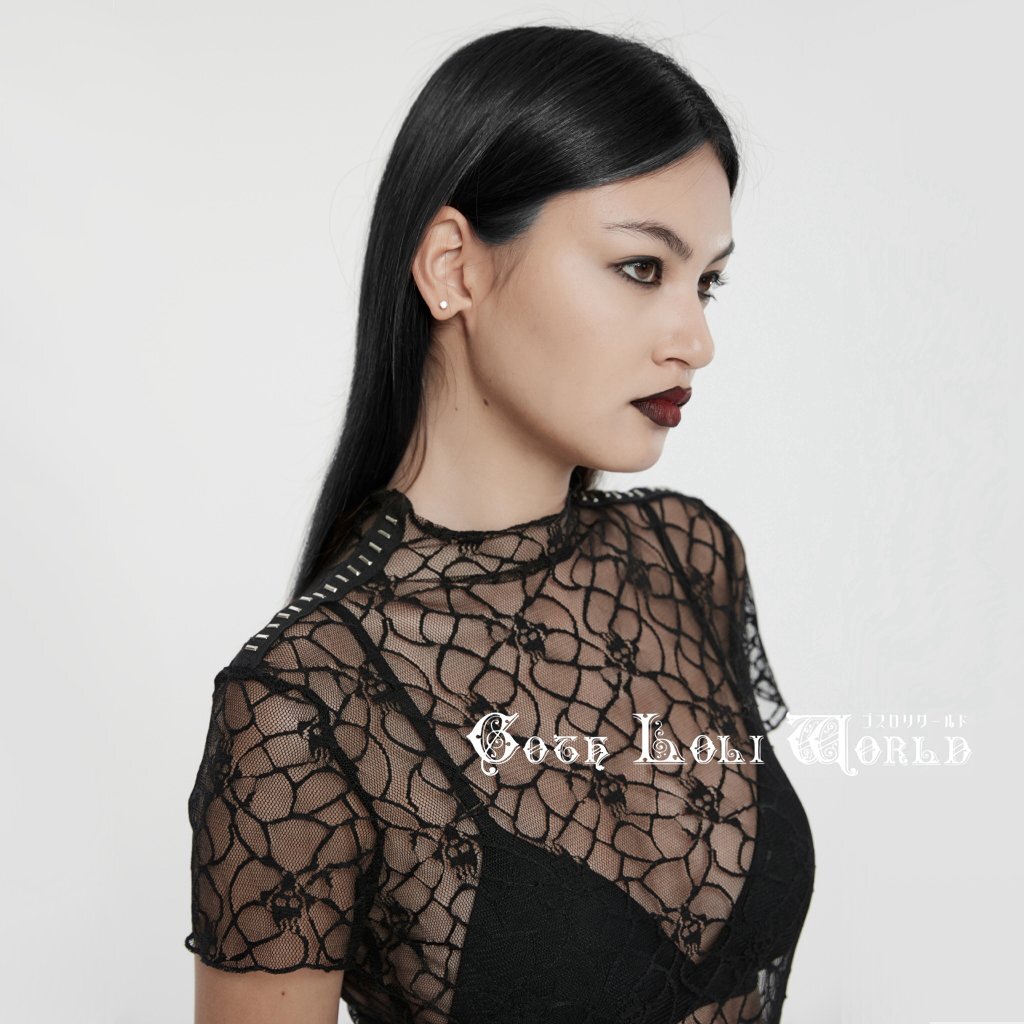 OT-864TDF-BK-XS-S シースルーモックネック半袖スタッズ カットソー 黒色 ゴスロリワールド ゴシック パンク ロック ビジュアル系 V系