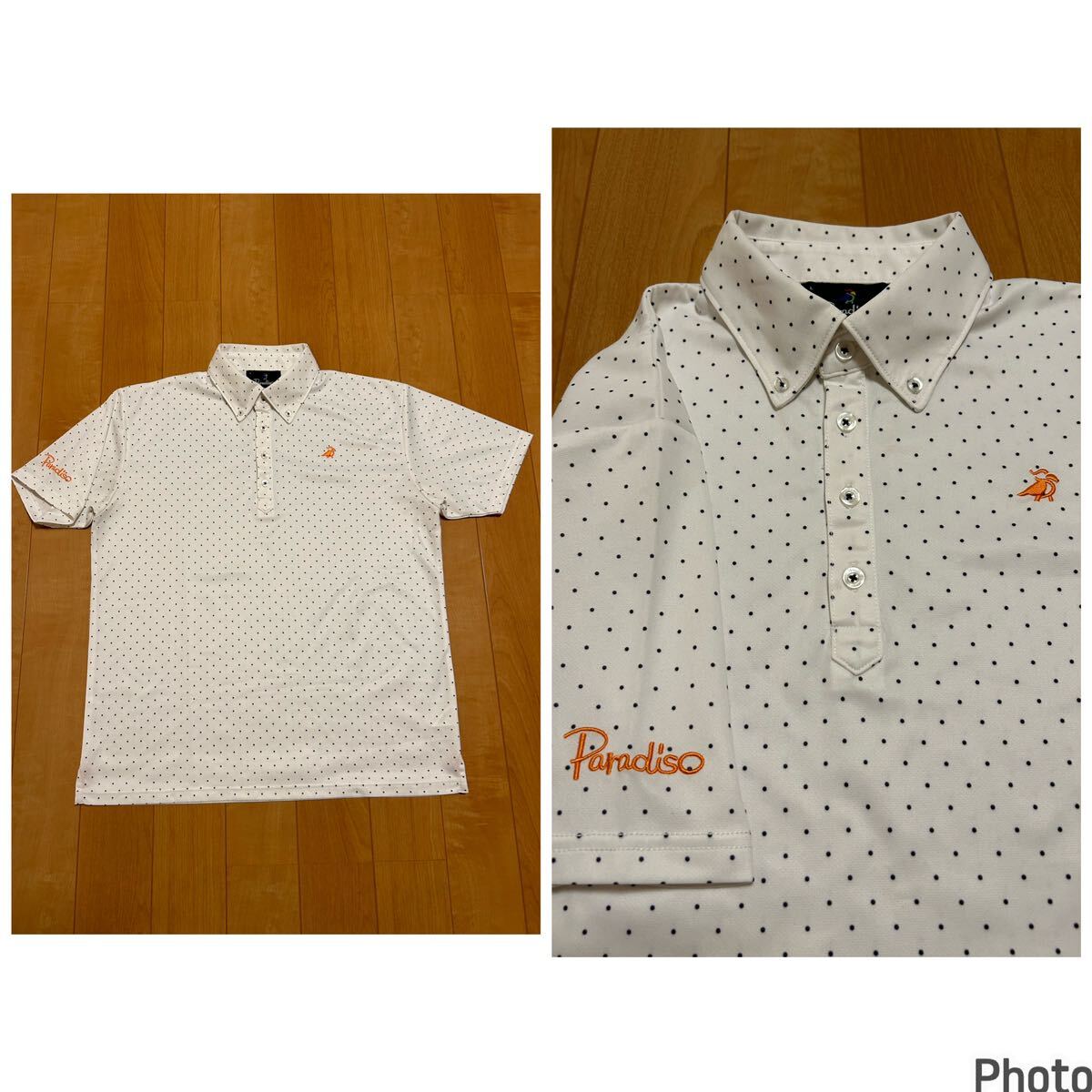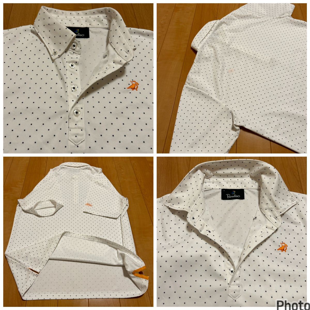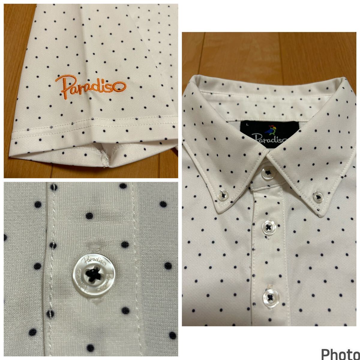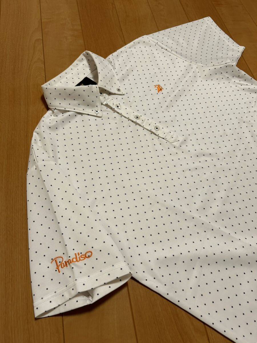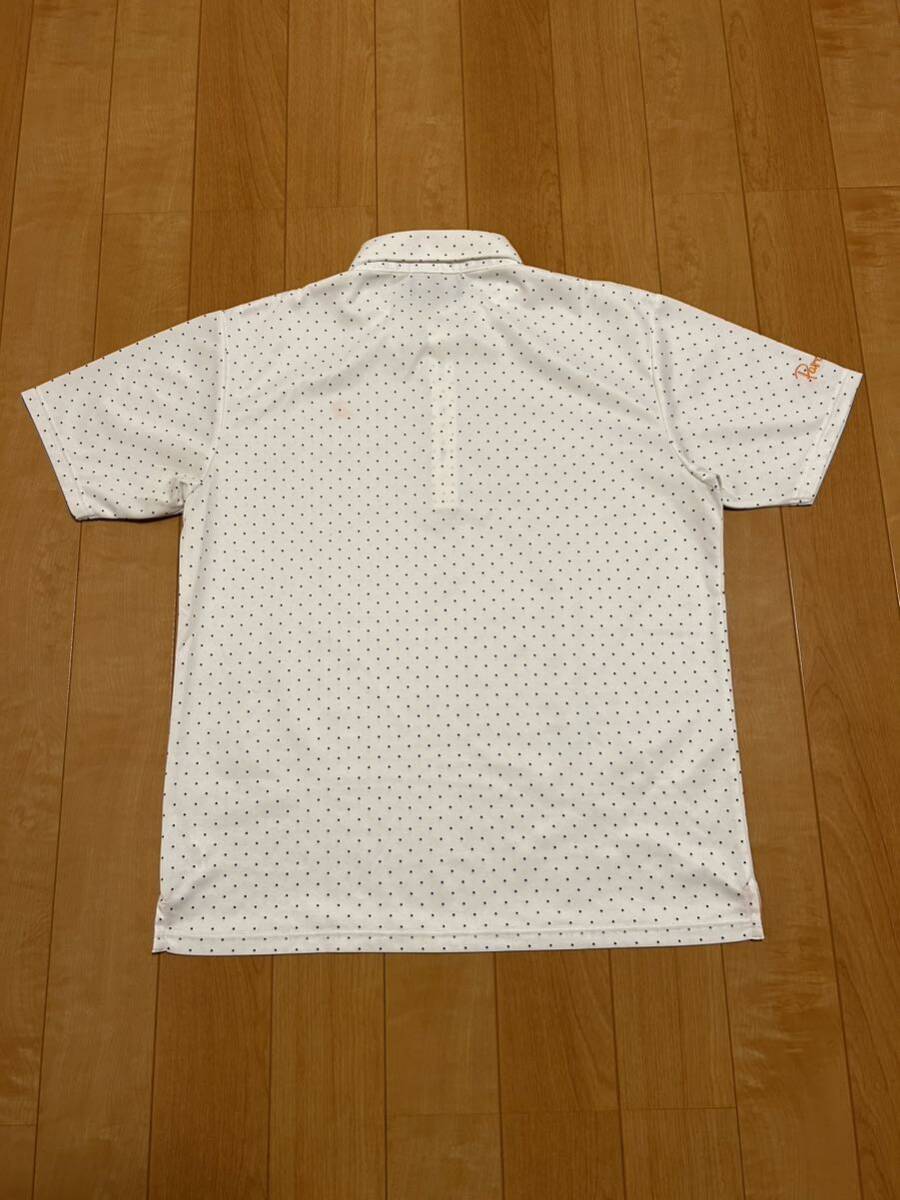 美品☆Paradiso/パラディーゾ サイズL 快適速乾ドライ.半袖BDポロシャツ 2面ロゴ刺繍入・水玉.ドット総柄デザイン!白系 ブリヂストン社
