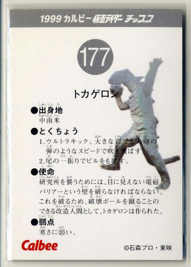 | ◆防水対策 厚紙補強 カルビー 仮面ライダーチップスカード(1999 復刻版) 177番 トカゲロン トレカ 即決 | |