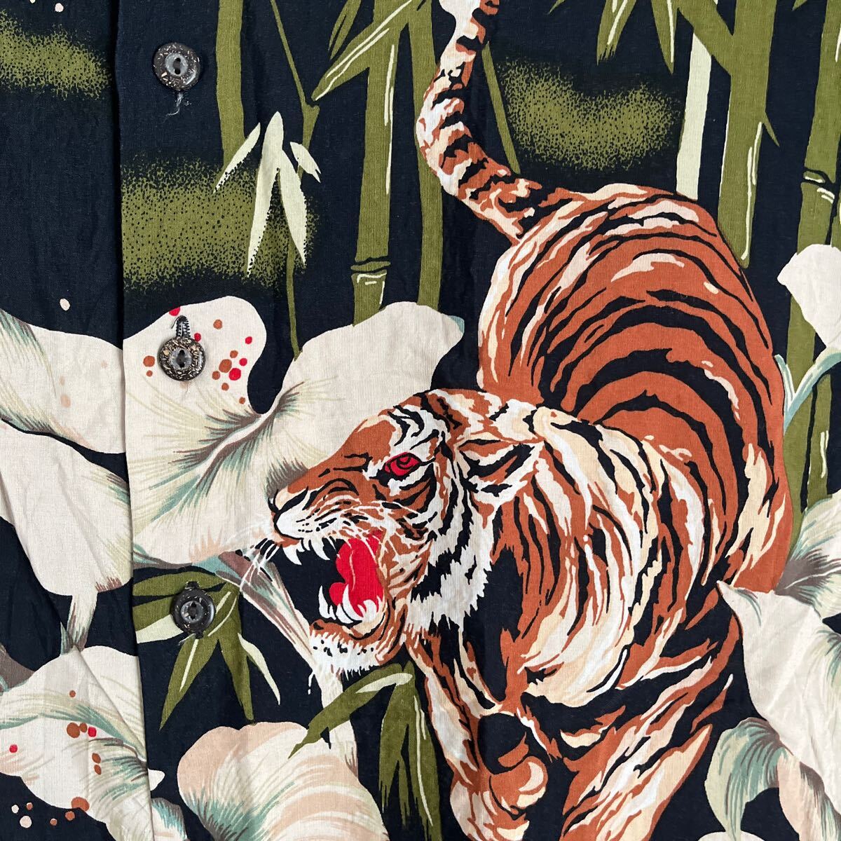 ブラックボディの前後に大きな虎柄が描かれており、とてもインパクトのあるアロハシャツです!