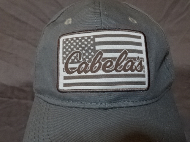 激レア USA購入 アメリカ企業モノ アウトドア系店舗 【Cabela's】 アメリカ星条旗デザイン ロゴワッペン付 キャップ グレー 中古良品