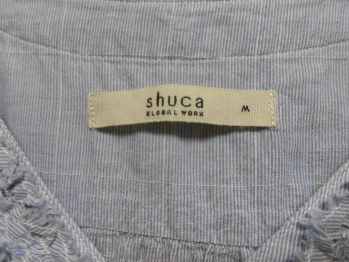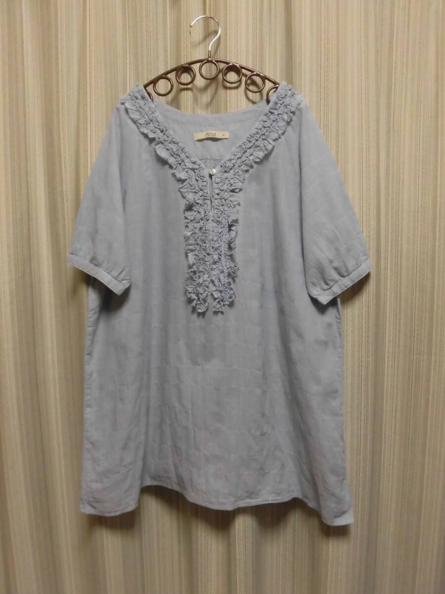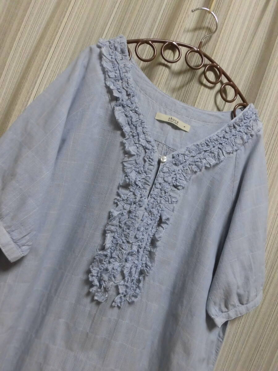shuca★涼しげ 胸元フリル キーネック パフスリーブ 半袖 トップス★プルオーバー/チュニック★レディース Mサイズ★ライトブルー