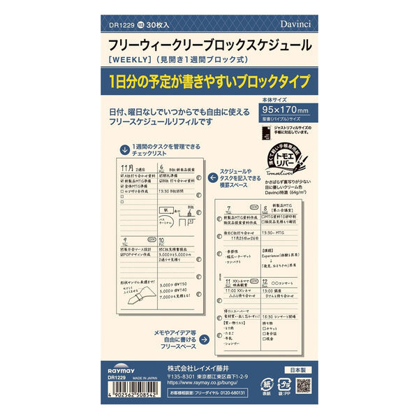 ・1日分の予定が書きやすいブロックタイプの週間リフィル(フリーウィークリー)。