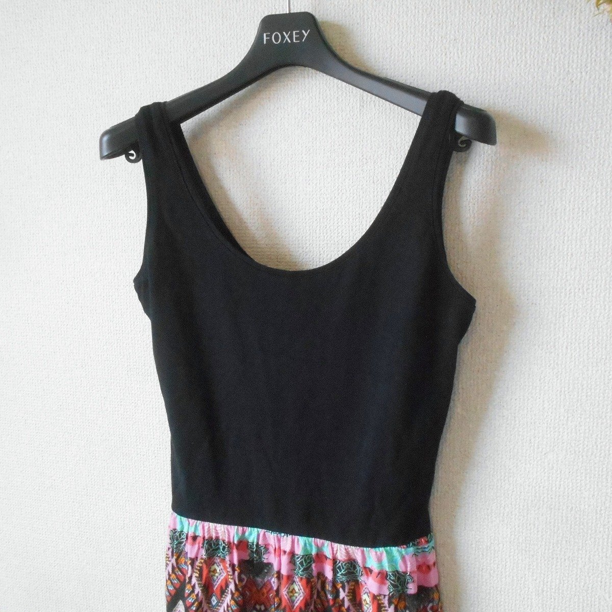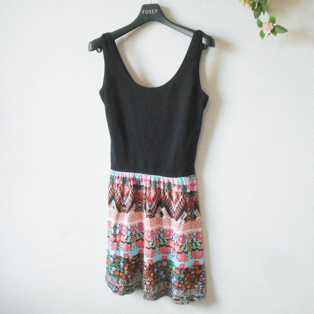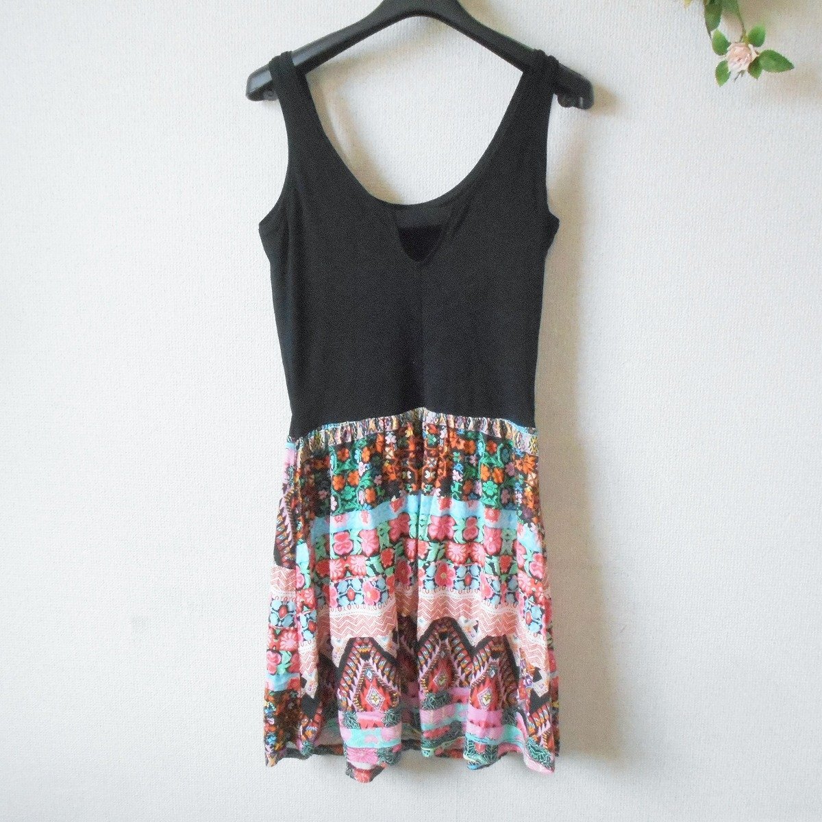 【ポイント】ベルシュカのノースリーブワンピースになります。お色は上部が黒色でスカート部分は多色使用の花柄、等、のプリントが入っています。Tシャツ生地の夏向きで、ミニ丈のとっても可愛い一着です。