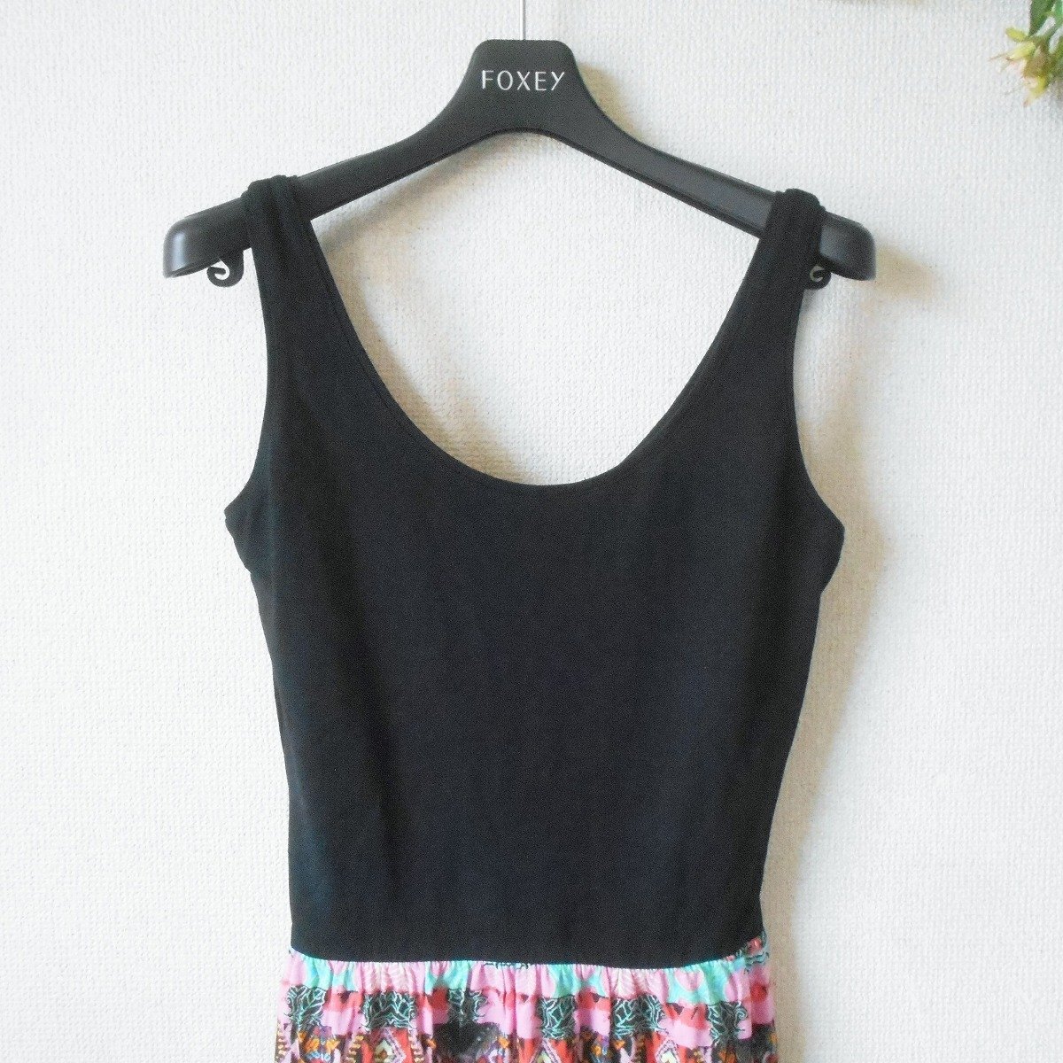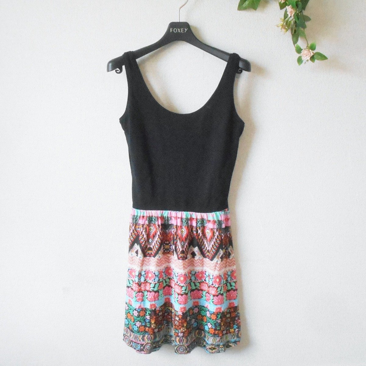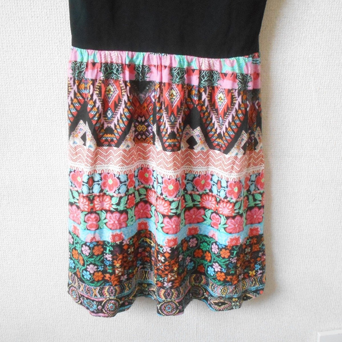【ポイント】ベルシュカのノースリーブワンピースになります。お色は上部が黒色でスカート部分は多色使用の花柄、等、のプリントが入っています。Tシャツ生地の夏向きで、ミニ丈のとっても可愛い一着です。