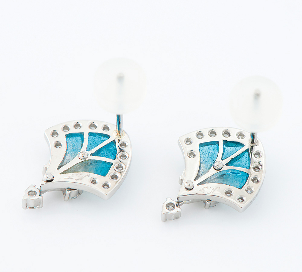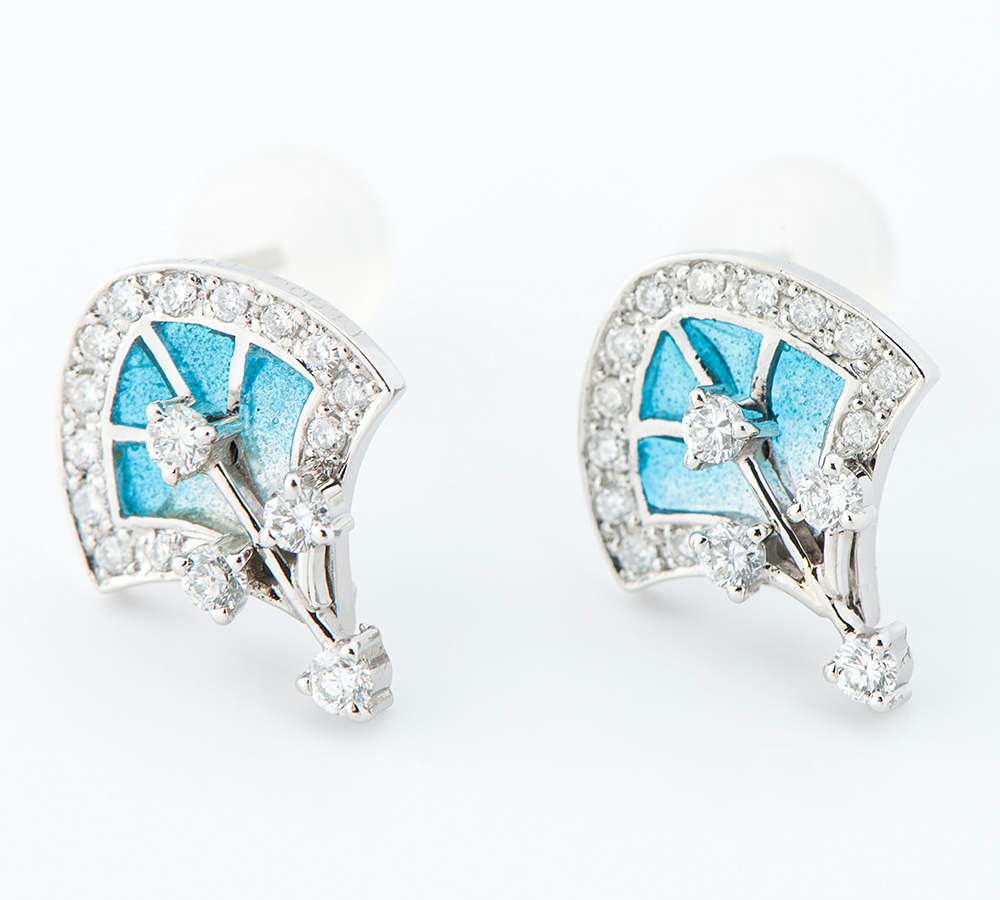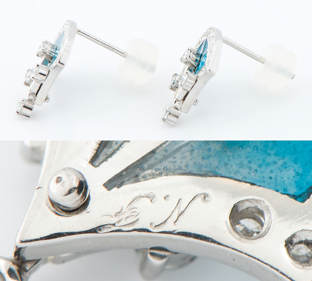 日本におけるエマイユ(七宝)ジュエリーの第一人者として高い評価を受けている、中嶋邦夫 ニックスファクトリー。透明感のあるプリカジュール・エマイユが美しいピアスです。ブルーのグラデーションとダイヤモンドの煌めきに気品が漂います。デイリーに楽しむことのできる、小振りなサイズも魅力的。職人の技術が光る、芸術的なジュエリーです。