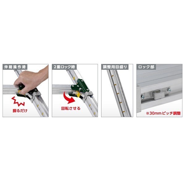 ![]() 作業スペースに合わせて調整できる伸縮天板・伸縮脚付足場台 転落を未然に防止する安全機能『足裏感知板』を採用しています 伸縮脚付(6mmピッチ)で段差も解消できます(最長395mm) 伸縮天板により天板の長さも調整できます アルミ製なので軽量で持ち運びも簡単 【商品詳細】 設置サイズ:幅42.3~49.5cmX奥行175.6~256.7cm 本体重量:14.5kg 段数(天板除く):3段 収納時サイズ:幅42.3cmX奥行126.6cmX高さ18.8cm 耐荷重:120kg 天板高さ(全長):86~125cm 天板サイズ:23.6cmX118.3~175.3cm 材質:アルミ合金 メーカー:アルインコ株式会社 型番:VSR-1713FX |