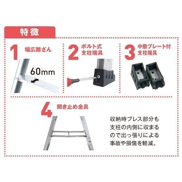 ![]() 高所作業に適した業務用の折りたたみ式専用脚立です 60mmの幅広踏ざん採用で作業効率が大幅にアップします 使いやすいワンタッチ式開き止め金具を採用しています ボルト式2支柱端具を使用 中敷プレート付支柱端具を使用 最大耐荷重は100kg 【商品詳細】 設置サイズ:幅84.7cmX奥行193.9cm 本体重量:14.9kg 段数(天板除く):8段 収納時サイズ:幅84.7cmX奥行17.4cmX高さ305.1cm 耐荷重:100kg 天板高さ(全長):2.88m 使用最大高さ:2.29m 材質:アルミ合金 メーカー:アルインコ株式会社 型番:MXB-300F 原産国:中国 |