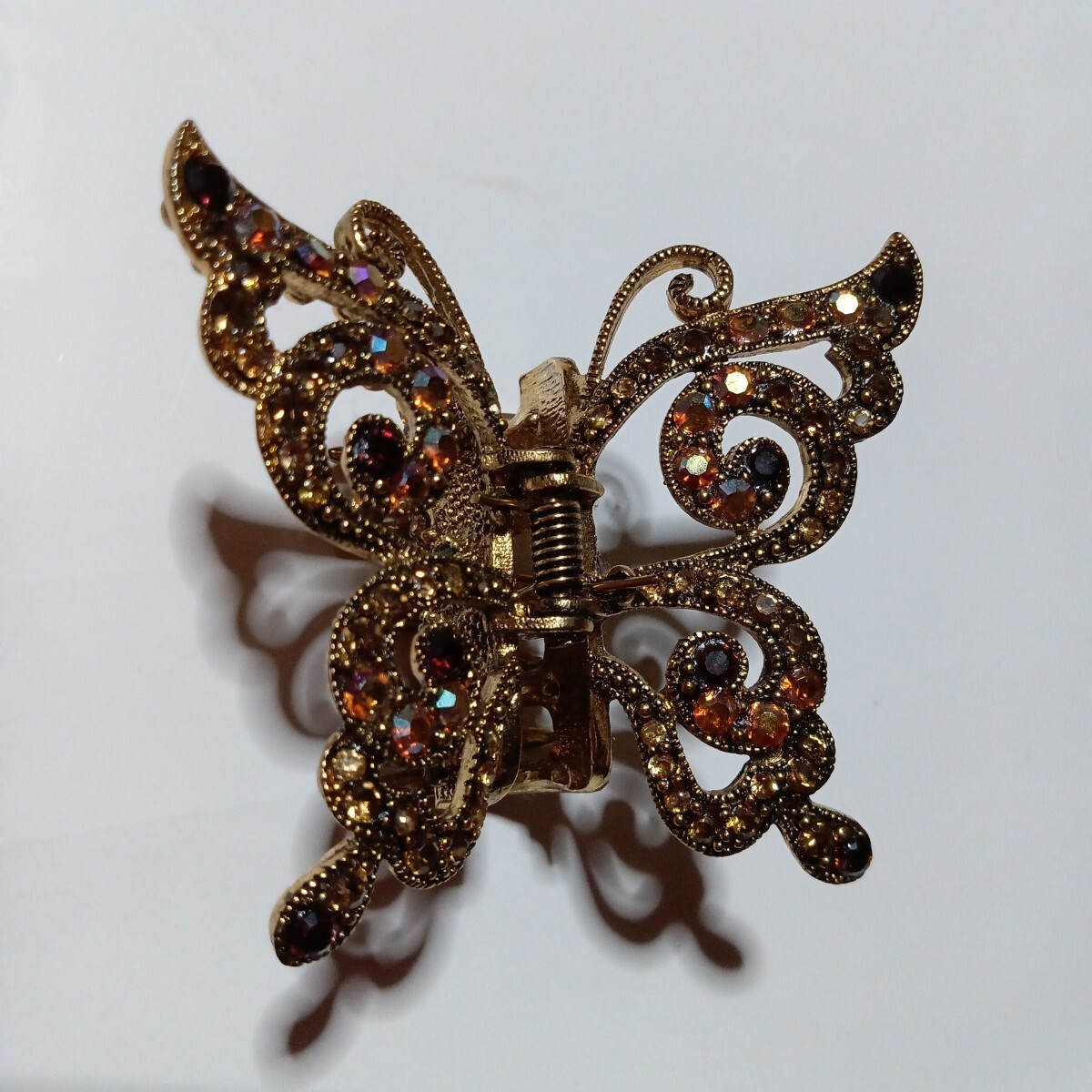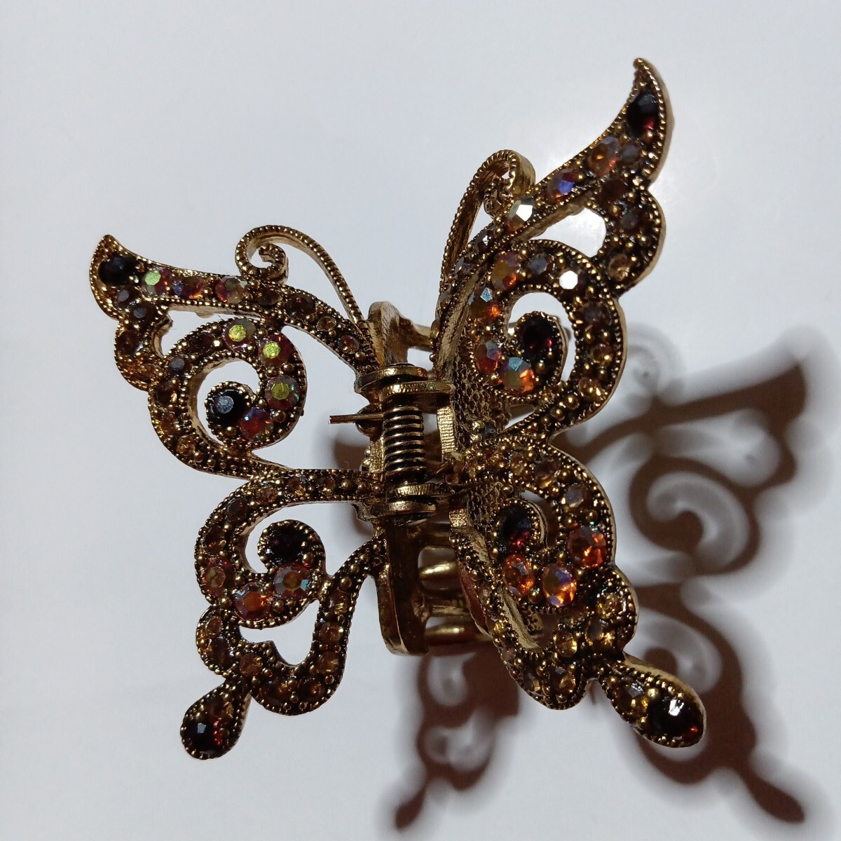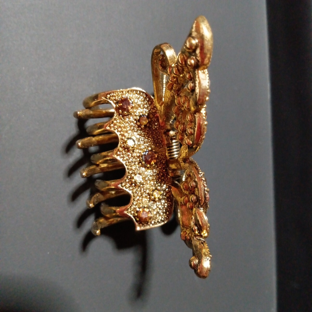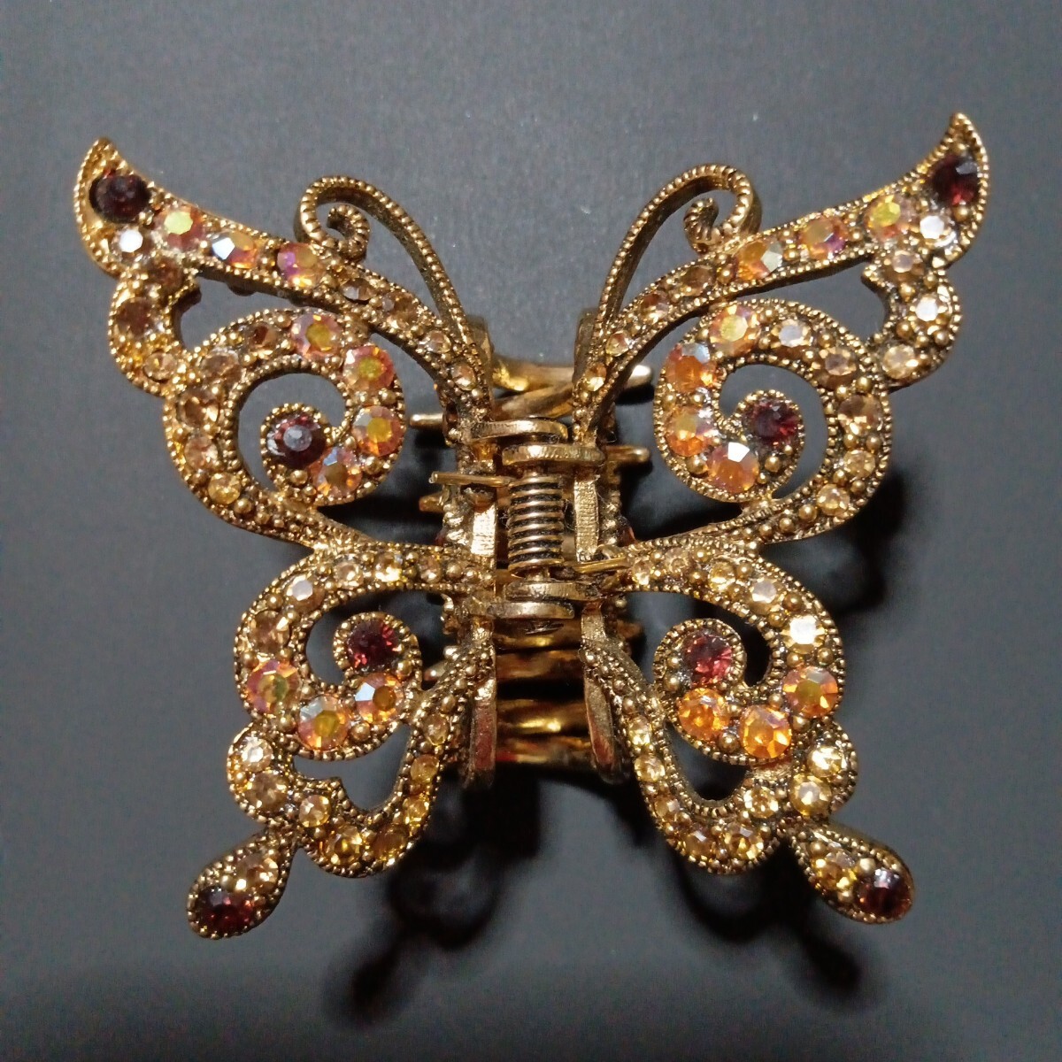ゴールドカラーのバタフライモチーフに、キラキラの美しいラインストーンが沢山施された、豪華でおしゃれなバンスクリップです。派手さを感じない落ち着いたトーンのゴールドカラーで上品な印象です。とてもしっかりした作りで、確認した所ストーンの落ち等も無さそうです。髪に蝶々が止まったイメージが楽しいヘアアクセサリーです。大事に保管しておりましたが、ご愛用頂ける方にお譲りしたいと思います。